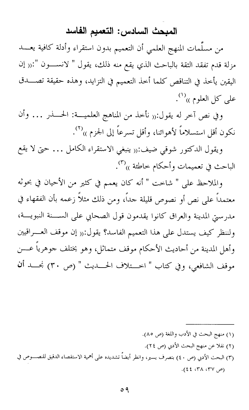 من مسلَّمات المنهج العلمي أن التعميم بدون استقراء وأدلة كافية يعد مزلة قدم تفقد الثقة بالباحث الذي يقع منه ذلك، يقول " لانسون ": ((إن اليقين يأخذ في التناقص كلما أخذ التعميم في التزايد، وهذه حقيقة تصدق على كل العلوم)) (1) .