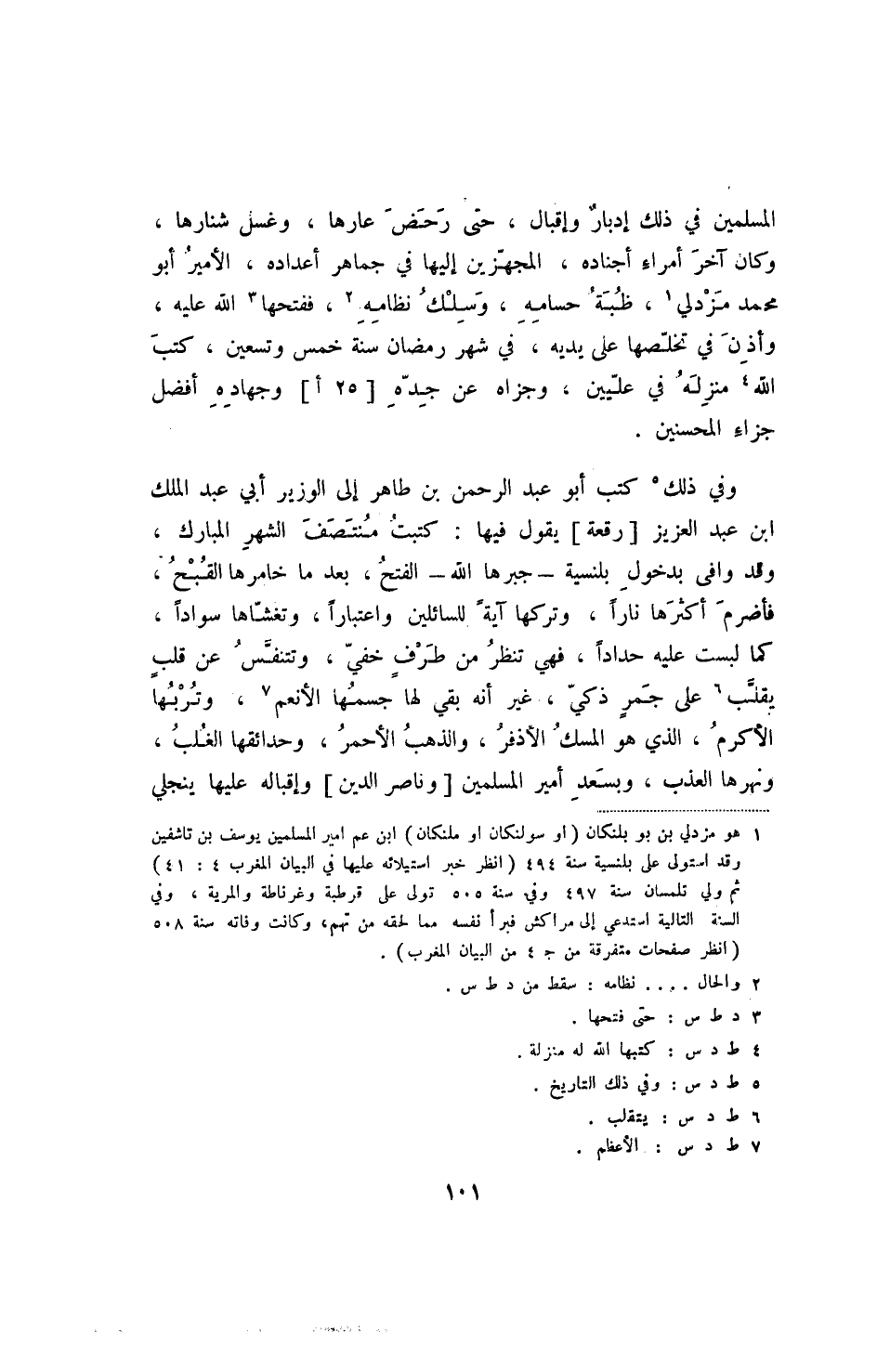 وفي ذلك كتب أبو عبد الرحمن بن طاهر إلى الوزير أبي عبد الملك ابن عبد العزيز [رقعة] يقول فيها: كتبت منتصف الشهر المبارك، وقد وافى بدخول بلنسية - جبرها الله - الفتح، بعد ما خامرها القبح، فأضرم أكثرها نارا، وتركها آية للسائلين واعتبارا، وتغشاها سوادا، كما لبست عليه حدادا، فهي تنظر من طرف خفي، وتتنفس عن قلب يقلب على جمر ذكي، غير أنه بقي لها جسمها الأنعم، وتربها الأكرم، الذي هو المسك الأذفر، والذهب الأحمر، وحدائقها الغلب، ونهرها العذب، وبسعد أمير المسلمين [وناصر الدين] وإقباله عليها ينجلي