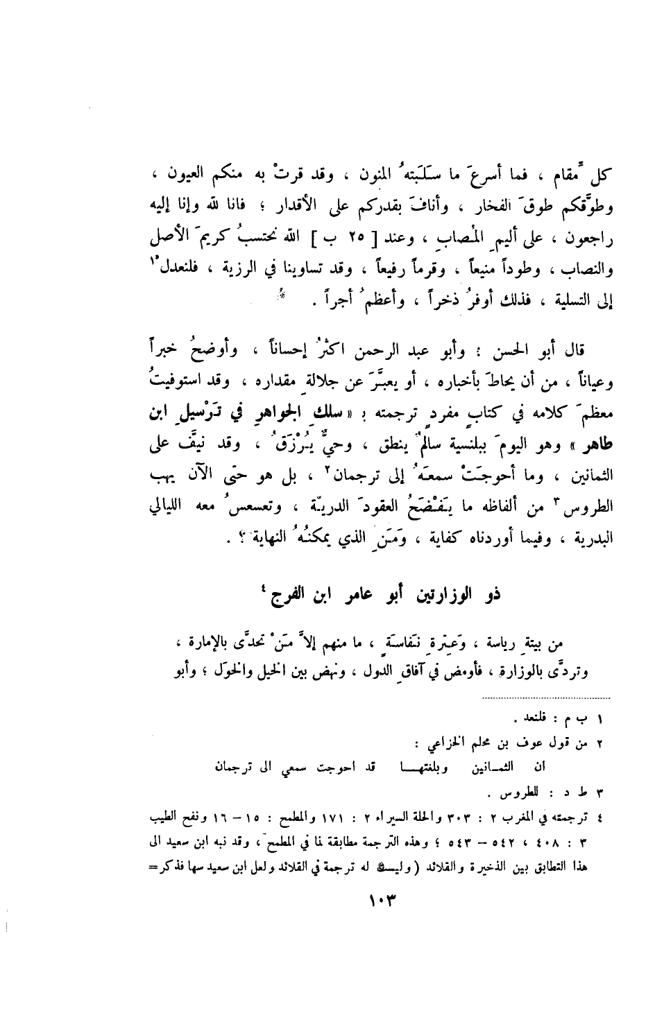 قال أبو الحسن: وأبو عبد الرحمن اكثر إحسانا، وأوضح خبرا وعيانا، من أن يحاط بأخباره، أو يعير عن جلاله مقداره، وقد استوفيت معظم كلامه في كتاب مفرد ترجمته ب " سلك الجواهر في ترسيل ابن طاهر " وهو اليوم ببلنسية سالم ينطق، وحي يرزق، وقد نيف على الثمانين، وما أحوجت سمعه إلى ترجمان، بل هو حتى الآن يهب الطروس من ألفاظه ما يفضح العقود الدرية، وتعسعس معه الليالي البدرية، وفيما أوردناه كفاية، ومن الذي يمكنه النهاية -.