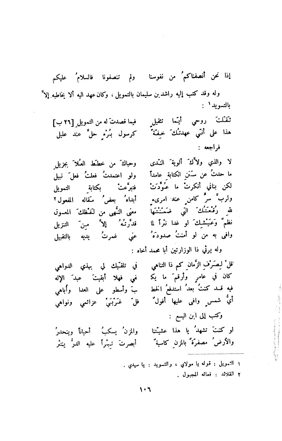 وله وقد كتب إليه راشد بن سليمان بالتمويل، وكان عهد اليه ألا يخاطبه إلا بالتسويد: