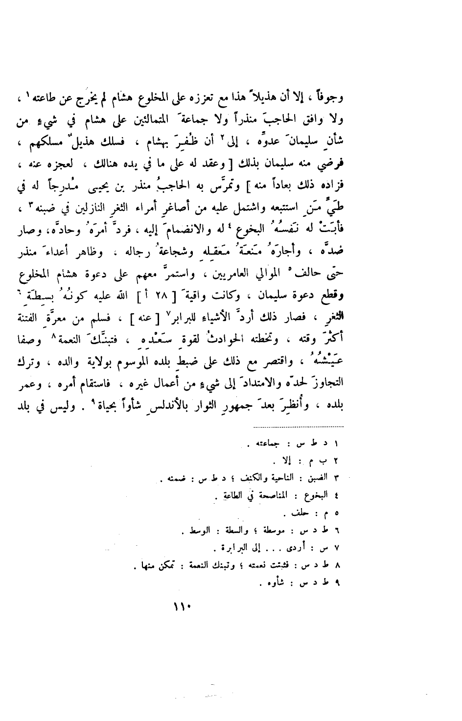 وجوفا، إلا أن هذيلا هذا مع تعززه على المخلوع هشام لم يخرج عن طاعته، ولا وافق الحاجب منذرا ولا جماعة المتمالئين على هشام في شيء من شأن سليمان عدوه، إلى أن ظفر بهشام، فسلك هذيل مسلكهم، فرضي منه سليمان بذلك [وعقد له ما في يده هنالك، لعجزه عنه، فزاده ذلك بعادا منه] وتمرس به الحاجب منذر بن يحيى مدرجا له في طي من استتبعه واشتمل عليه من أصاغر أمراء الثغر النازلين في ضبنه، فأبت له نفسه البخوع له والانضمام إليه، فرد مره وحاده، وصار ضده، وأجاره منعه معقلة وشجاعة رجاله، وظاهر أعداء منذر حتى حالف الموالي العامريين، واستمر معهم على دعوة هشام المخلوع وقطع دعوة سليمان، وكانت واقعية [28أ] الله عليه كونه بسطة الثغر، فصار ذلك أرد الأشياء للبرابر [عنه] ، فسلم من معرة الفتنة أكثر وقته، وتخطته الحوادث لقوة سعده، فتبنك النعمة وصفا عيشه، واقتصر مع ذلك على ضبط بلده الموسوم بولاية والده، وترك التجاوز لحده والامتداد إلى شيء من أعمال غيره، فاستقام أمره، وعمر بلده، وأنظر بعد جمهور الثوار بالأندلس شأوا بحياة. وليس في بلد