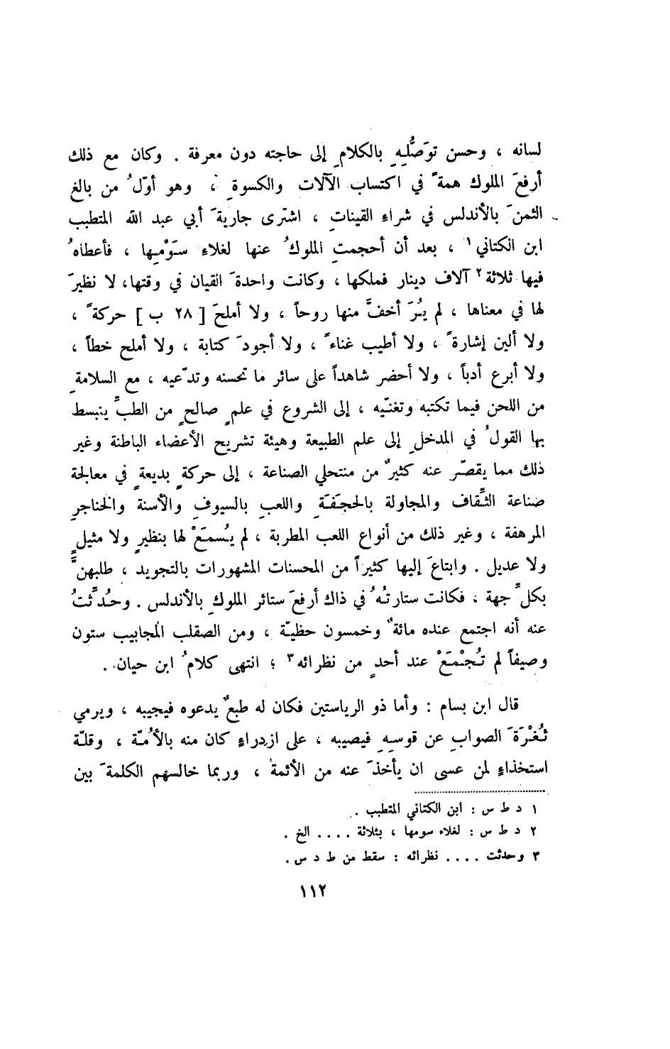 لسانه، وحسن توصله إلى حاجته دون معرفة. وكان مع ذلك أرفع الملوك همة في اكتساب الآلات والكسوة، وهو أول من بالغ الثمن بالأندلس في شراء القيتات، اشترى جارية أبي عبد الله المتطبب ابن الكتاني، بعد أن احجمت الملوك عنها لغلاء سومها، فأعطاه غيها ثلاثة آلاف دينار فملكها، وكانت واحدة القيان في وقتها، لا نظير لها في معناها، لم ير أخف منها روحا، ولا أملح [28ب] حركة، ولا ألين إشارة، ولا أطيب غناء، ولا أجود كتابة، ولا أملح خطأ، ولا أبرع أدبا، ولا أحضر شاهدا على سائر ما تحسنه وتدعيه، مع السلامة من اللحن فيما تكتبه وتغنيه، إلى الشروع في علم صالح من الطب ينبسط بها القول في المدخل إلى علم الطبيعة وهيئة تشريح الأعضاء الباطنة وغير ذلك مما يقصر عنه كثير من منحلي الصناعة، إلى حركة بديعة في معالجة صناعة الثقاف والمجاولة بالحجفة واللعب بالسيوف والأسنة والخناجر المرهفة، وغير ذلك من أنواع اللعب المطربة، لم يسمع لها بنظير ولا مثيل ولا عديل. وابتاع إليها كثيرا من المحسنات المشهورات بالتجويد، طلبهن بكل جهة، فكانت ستارته في ذاك أرفع ستائر الملوك بالأندلس. وحدثت عنه أنه اجتمع عنده مائة وخمسون حظية، ومن الصقلب المجابيب ستون وصيفا لم تجمع عند أحد من نظرائه؛ انتهى كلام ابن حيان.