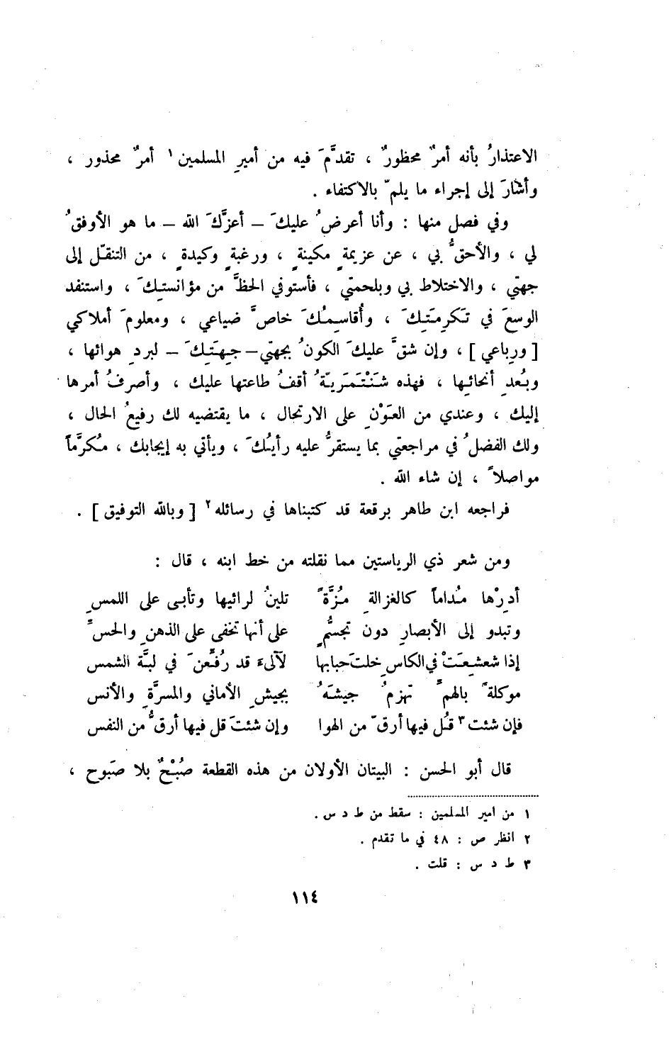 ومن شعر ذي الرياستين مما نقله من خط ابنه، قال: