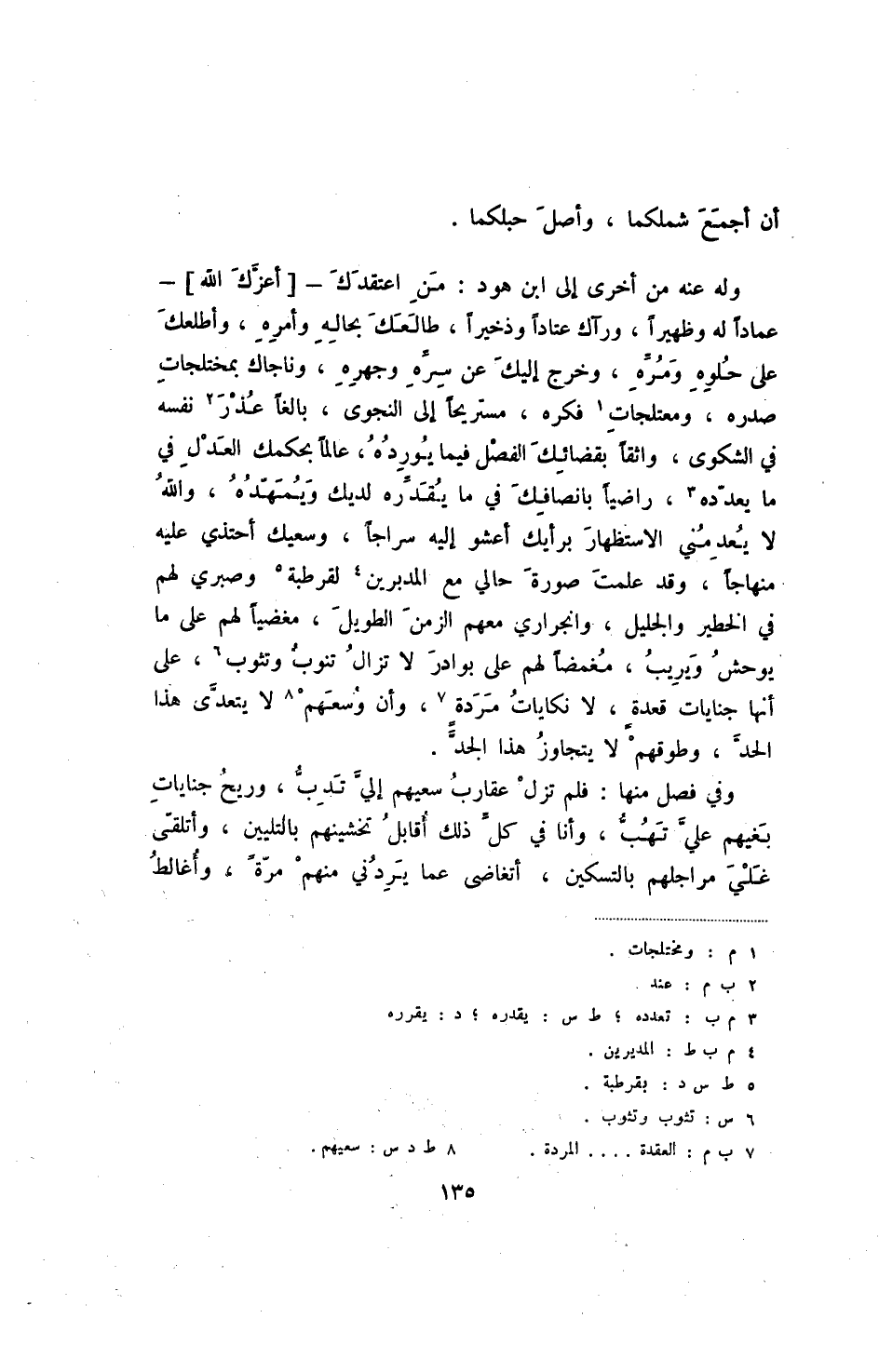 وفي فصل منها: فلم تزل عقارب سعيهم إلي تدب، وريح جنايات بغيهم علي تهب، وأنا في كل ذلك أقابل تخشينهم بالتلين، وأتلقى غلي مراجلهم بالتسكين، أتغاضى عما يردني منهم مرة، وأغالط