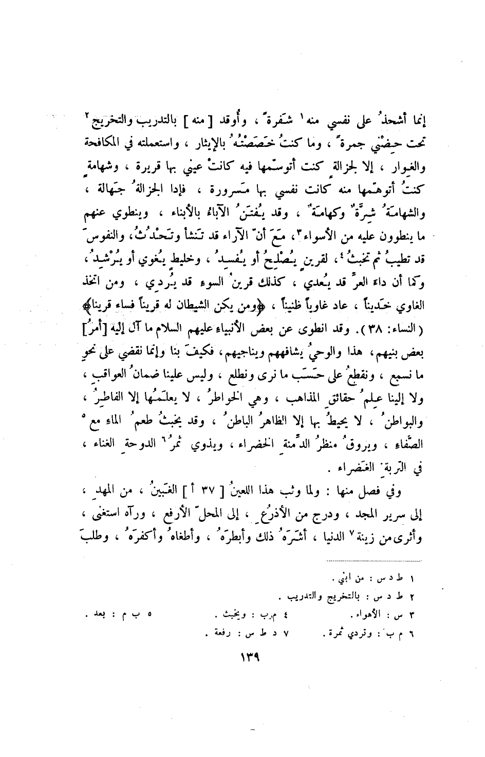 إنما أشحذ على نفسي منه شفرة، وأوقد [منه] بالتدريب والتخريج تحت حضني جمرة، وما كنت خصصته بالإيثار، واستعملته في المكافحة والغوار، إلا لجزالة كنت أتوسمها فيه كانت عيني بها قريرة، وشهامة كنت أتوهمها منه كانت نفسي بها مسرورة، فإذا الجزالة جهالة، والشهامة شرة وكهامة، وقد يفتن الآباء بالأبناء، وينطوي عنهم ما ينطوون عليه من الأسواء، مع أن الآراء قد تنشأ وتحدث، والنفوس قد تطيب ثم تخبث، لقرين يصلح أو يفسد، وخليط يغوي أو يرشد، وكما أن داء العر يعدي، كذلك قرين السوء قد يردي، ومن اتخذ الغاوي خدينا، عاد غاويا ظنينا، (ومن يكن الشيطان له قرينا فساء قرينا) (النساء: 38) . وقد انطوى عن بعض الأنبياء عليهم السلام ما آل إليه [أمر] بعض بينهم، هذا والوحي يشافههم ويناجيهم، فكيف بنا وإنما نقضي على نحو ما نسمع، ونقطع على حسب ما نرى ونطلع، وليس علينا ضمان العواقب، ولا إلينا علم حقائق المذاهب، وهي الخواطر، لا يعلمها إلا الفاطر، والبواطن، لا يحيط بها إلا الظاهر الباطن، وقد يخبث طعم الماء مع الصفاء، ويروق منظر الدمنة الخضراء، ويذوي ثمر الدوحة الغناء، في التربة الغضراء.