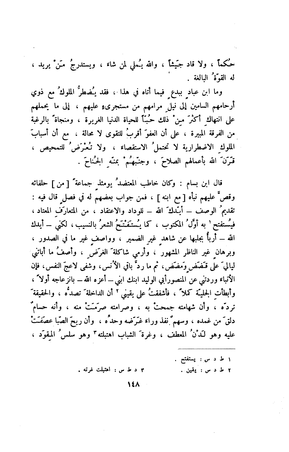 قال ابن بسام: وكان خاطب المعتضد يومئذ جماعة [من] حلفائه وقص عليهم نبأة [مع ابنه] ، فمن جواب بعضهم له في فصل قال فيه: تقديم الوصف - أيدك الله - للوداد والاعتقاد، من المتعارف المعتاد، فيستفتح به أول المكتوب، كما يستفتح الشعر بالنسيب، لكني - أيدك الله - أربا بحبلها عن شاهد غير الضمير، وواصف غير ما في الصدور، وبرهان غير الناظر المشهور، وأرمي شاكله الغرض، وأصف ما أباتني ليالي على قضض ومضض، ثم ما رد باقي الأنس، وشفى لاعج النفس، فإن الأنباء وردتني عن المنصور أبي الوليد ابنك ابني - أعزه الله - بانزعاجه أولا، وأبطأت الجلية كملا، فأشفقت على يقيني أن الداخلة تصده، والحقيقة ترده، وأن شهامته جمحت به، وصرامته صرمت منه، وأنه حسام دلق من غمده، وسهم نفذ وراء غرضه وحده، وأن ريح الصبا عصفت عليه وهو لدن المعطف، وغرة الشباب اهتبلته وهو سلس المقود