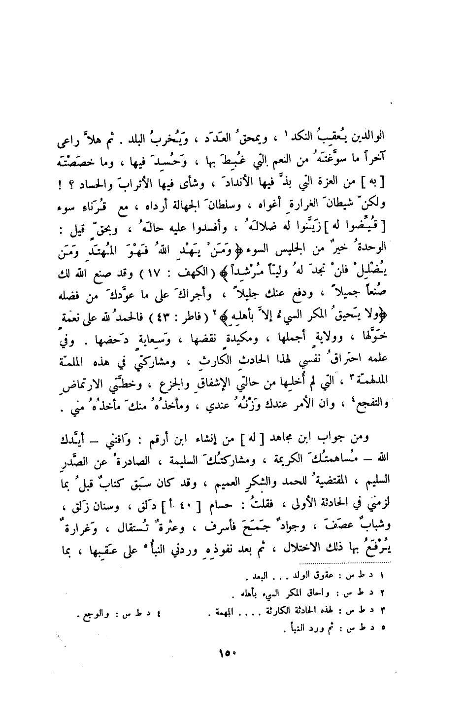 الوالدين يعقب النكد، ويمحق العدد، ويخرب البلد. ثم هلا راعى آخرا ما سوغته من النعم التي غبط بها، وحسد فيها، وما خصصته [به] من العزة التي بذ فيها الأنداد، وشأى فيها الأتراب والحساد -! ولكن الشيطان الغرارة أغواه، وسلطان الجهالة أرداه، مع قرناء سوء [قيضوا له] زينوا له ضلالة، وأفسدوا عليه حاله، وبحق قيل: الوحدة خير من الجليس السوء (ومن يهد الله فهو المهتد ومن يضلل فلن تجد له وليا مرشدا) (الكهف: 17) وقد صنع الله لك صنعا جميلا، ودفع عنك جليلا، وأجراك على ما عودك من فضله (ولا يحيق المكر السيء إلا بأهله) (فاطر: 43) فالحمد لله على نعمة خولها، وولاية أجملها، ومكيدة نقضها، وسعاية دحضها. وفي علمه احتراق نفسي لهذا الحادث الكارث، ومشاركتي في هذه الملمة المدلهمة، التي لم أخلها من حالتي الإشفاق والجزع، وخطتي الارتماض والتفجع، وان الأمر عندك وزنه عندي، ومأخذه منك مأخذه مني.