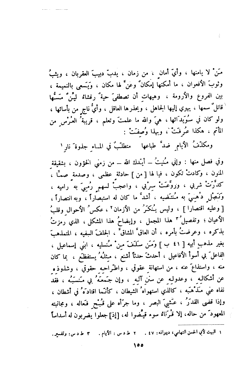 ومكلف الأيام ضد طباعها ... متطلب في الماء جذوة نار وفي فصل منها: وإني منيت - أيدك الله - من زمني الخؤون، بشقيقة المنون، وكادت تكون، فيا لها [من] حادثة عظمى، وصدمة صما، كدرت شربي، وروعت سربي، واعجب لسهم رمي به راميه، ونصل دهي به منتضيه، أشد ما كان له استبصارا، وبه انتصارا، [وعليه اقتصارا] ، وليس يمكر من الأزمان، عكس الأحوال وقلب الأعيان؛ وتفصيل هذا المجمل، وإيضاح هذا المشكل، الذي رمزت بذكره، وعرضت بأمره، أن العاق المشاق، الجلف السفيه، المتمذهب بغير مذهب أبيه [41ب] ومن سلف من منسليه، ابني إسماعيل، الفاعل بي أسوأ الأفاعيل، أحدث حدثا أشنع، مثله يستفظع، بما كان منه، واستذاع عنه، من استهانة عقوقي، واطراحه حقوقي، وشذوذه عن أشكاله، وعدوله عن سنن آله، وإن جمعه بي منسبه، فقد نفاه عني مذهبه، كالذي استواه الشيطان، كأنما اقتاده في أشطان، وإذا قضى القدر، عشي البصر، وما جرأه على قبح فعاله، ومجانبته المعهود من حاله، إلا قرناء سوء قيضوا له، [إذ] جعلوا يضربون له أسداسا