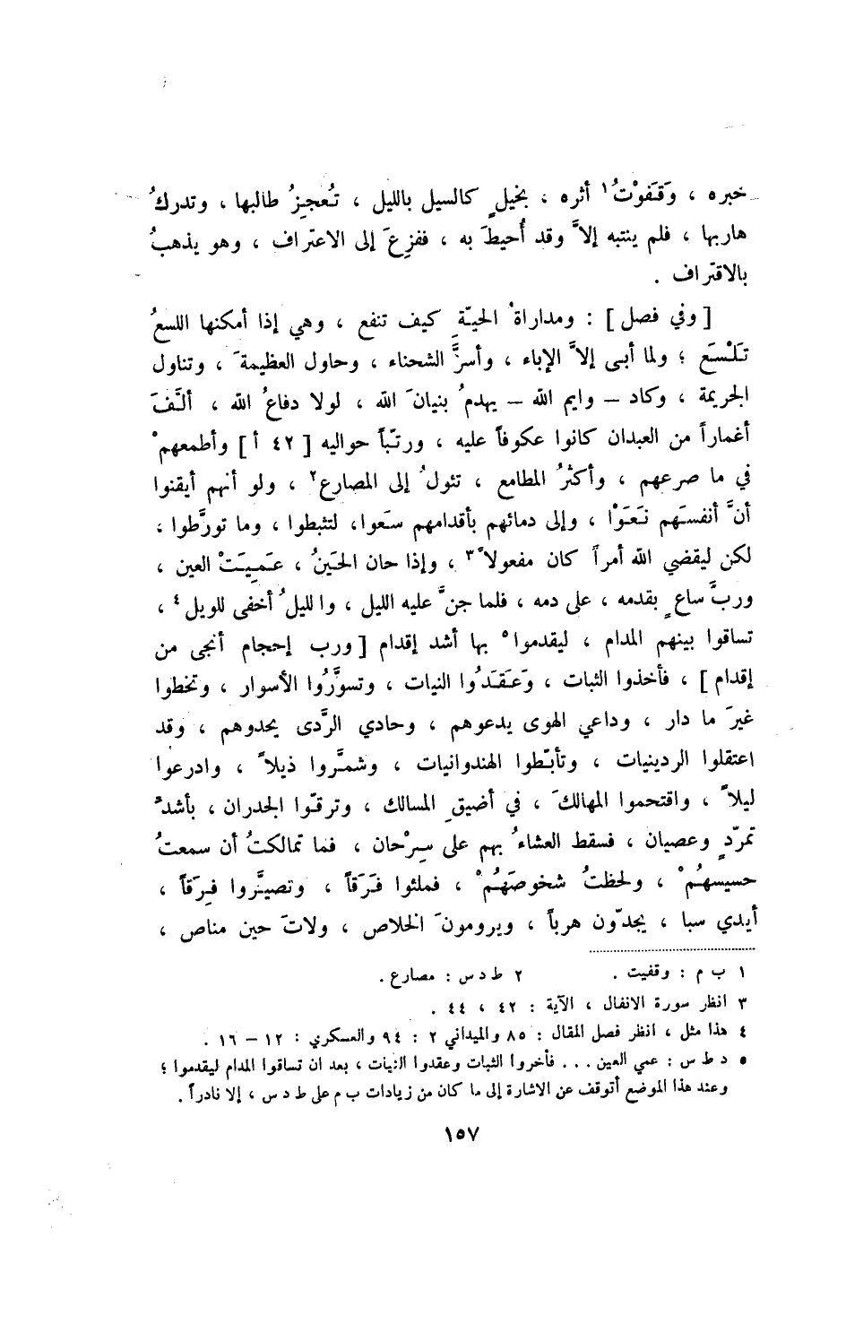 [وفي فصل] : ومداراة الحية كيف تنفع، وهي إذا أمكنها اللسع تلسع؛ ولما أبى إلا الإباء، وأسر الشحناء، وحاول العظيمة، وتناول الجريمة، وكاد - وايم الله - يهدم بنيان الله، لولا دفاع الله، ألف أغمارا من العبدان كانوا عكوفا عليه، ورتبا حواليه [42أ] وأطمعهم في ما صرعهم، وأكثر المطامع، تئول إلى المصارع، ولو أنهم أيقنوا أن أنفسهم نعوا، وإلى دمائهم بأقدامهم سعوا، لتثبطوا، وما تورطوا، لكن ليقضي الله أمرا كان مفعولا، وإذا حان الحين، عميت العين، ورب ساع بقدمه، على دمه، فلما جن عليه الليل، والليل أخفى للويل، تساقوا بينهم المدام، ليقدموا بها أشد ٌقدام [ورب إحجام أنجى من إقدام] ، فأخذوا الثبات، وعقدوا النيات، وتسوروا الأسوار، وتخطوا غير ما دار، وداعي الهوى يدعوهم، وحادي الردى يحدوهم، وقد اعتقلوا الردينيات، وتأبطوا الهندوانيات، وشمروا ذيلا، وادرعوا ليلا، واقتحمواالمهالك، في أضيق المسالك، وترقوا الجدران، بأشد تمرد وعصيان، فسقط العشاء بهم على سرحان، فما تمالكت أن سمعت حسيسهم، ولحظت شخوصهم، فملئوا فرقا، وتصيروا فرقا، أيدي سبا، يجدون هربا، ويرومون الخلاص، ولات حين مناص