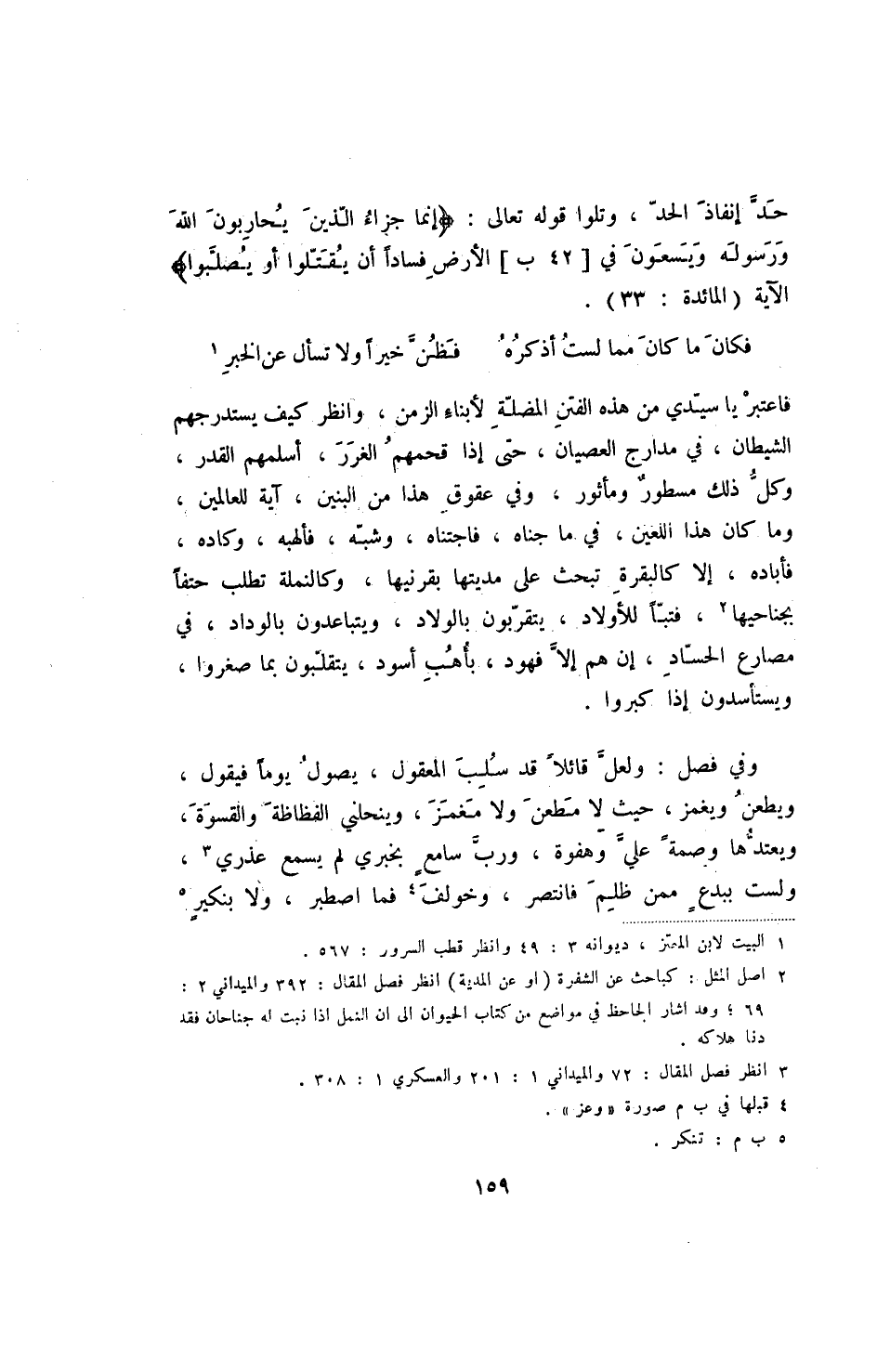 وفي فصل: ولعل قائلا قد سلب المعقول، يصول يوما فيقول، ويطعن ويغمز، حيث لا مطعن ولا مغمز، وينحلني الفظاظة والقسوة، ويعتدها وصمة علي وهفوة، ورب سامع بخبري لم يسمع عذري، ولست ببدع ممن ظلم فانتصر، وخولف فما اصطبر، ولا بنكير