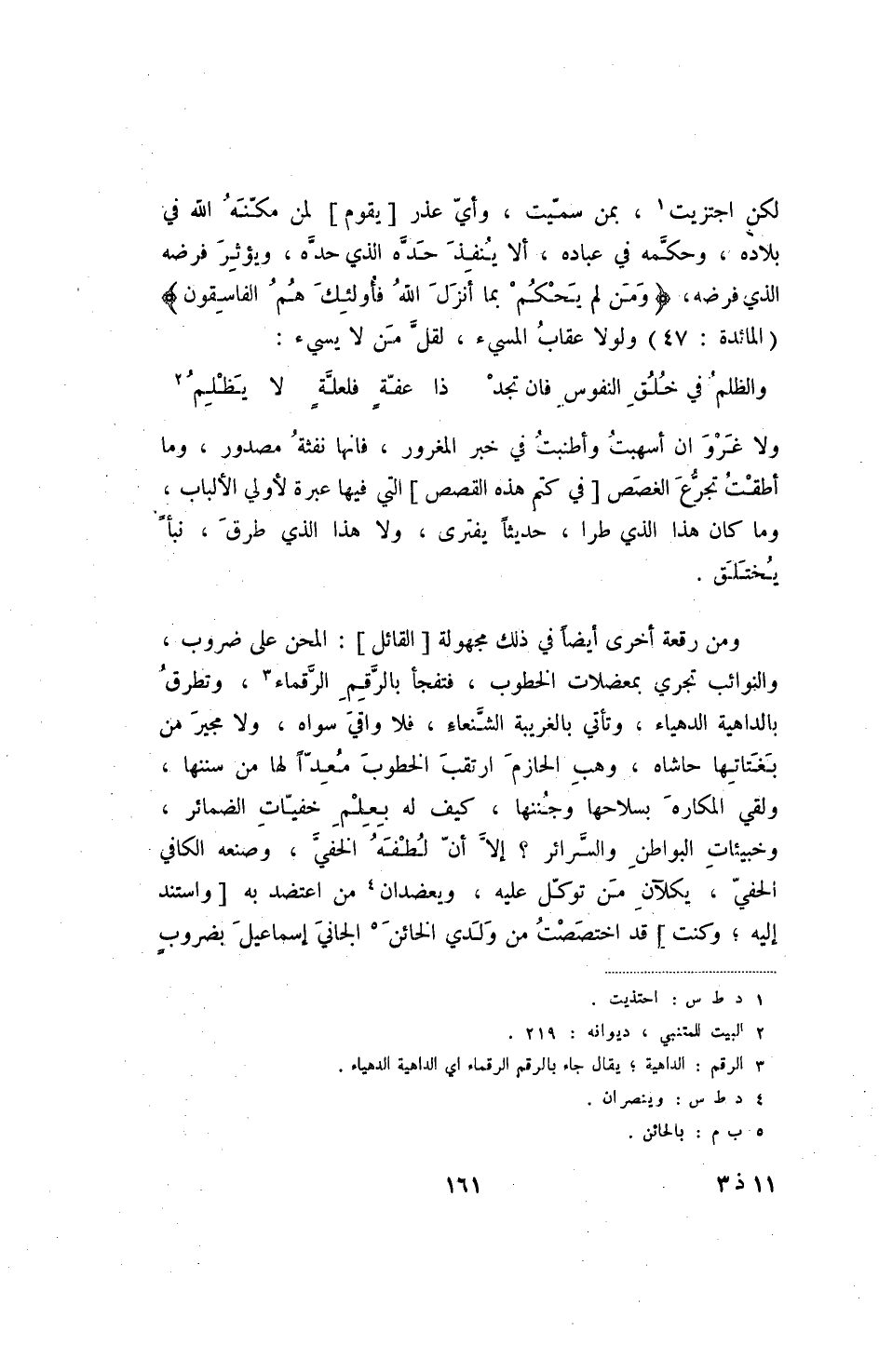 لكن اجتزيت، بمن سميت، وأي عذر [يقوم] لمن مكنه الله في بلاده، وحكمه في عباده، ألا ينفذ حده الذي حده، ويؤثر فرضه الذي فرضه، (ومن لم يحكم بما أنزل الله فأولئك هم الفاسقون) (المائدة: 47) ولولا عقاب المسيء، لقل من لا يسيء: