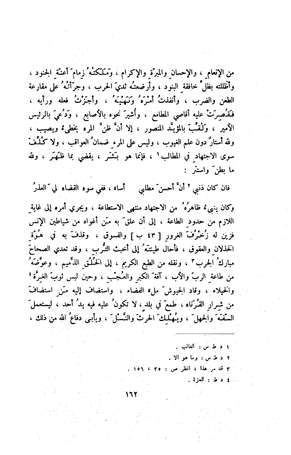 من الإنعام، والإحسان والمبرة والإكرام، وملكته زمام أعنة الجنود، وأظللته بظل خافقة البنود، وأرضعته ثدي الحرب، وجرأته على مقارعة الطعن والضرب، وأنفذت أمره ونهيه، وأجزت فعله ورأيه، فقصرت عليه أقاصي المطامع، وأشير نحوه بالأصابع، ودعي بالرئيس الأمير، ولقب بالمؤيد المنصور، إلا أن ظن المرء يخطئ ويصيب، ولله أستار دون علم الغيوب، وليس على المرء ضمان العواقب، ولا كلف سوى الاجتهاد في المطالب، فإنما هو بشر، يقضي بما ظهر، ولله ما بطن واستتر: