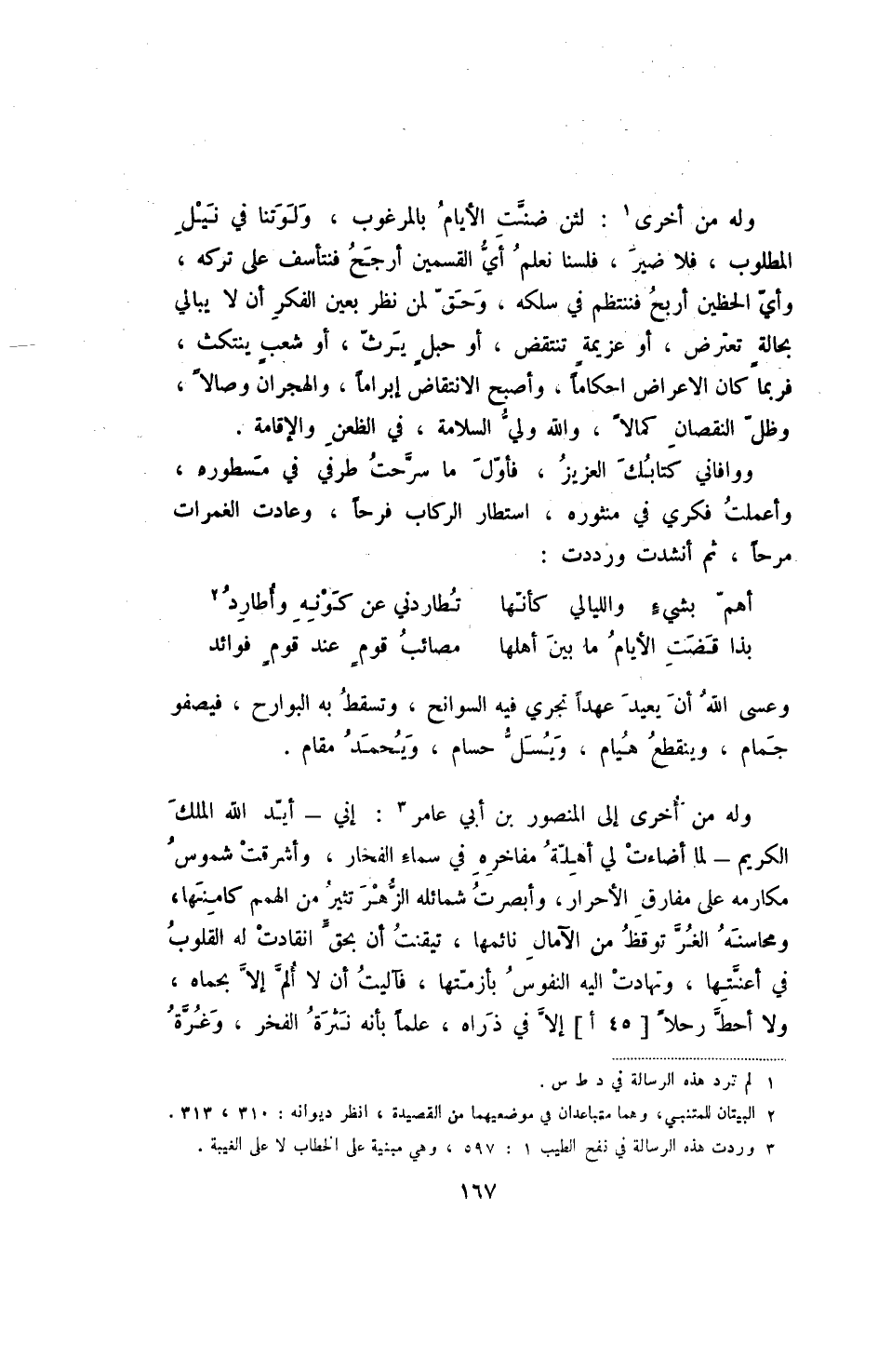 ووافاني كتابك العزيز، فأول ما سرحت طرفي في مسطوره، وأعلمت فكري في منثوره، استطار الركاب فرحا، وعادت الغمرات مرحا، ثم أنشدت ورددت: