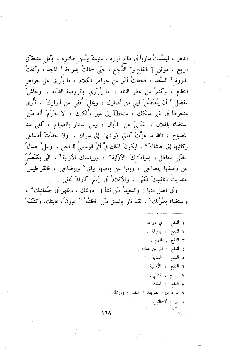 الدهر، فيممت ساريا في طالع نوره، متيمنا بيمن طائره، بأمل متحقق الربح، موقن [بالفلج و] النجح، حتى حللت بدرجة المجد، وأنخت بذروة السعد، فجعلت أنثر من جواهر الكلام، ما يربي على جواهر النظام، وأنشر من عطر الثناء، ما يزري بالروضة الغناء، وحاش للفضل أن يعطل ليلي من أقمارك، ويخلي أفقي من أنوارك، فأرى منخرطا في غير سلكك، منحطا إلى غير ملكك، لا جرم أنه من استضاء بالهلال، غني عن الذبال، ومن استنار بالصباح، ألغى سنا المصباح؛ تالله ما هزت آمالي ذوائبها إلى سواك، ولا حدث أطماعي ركائبها إلى حاشاك، ليكون لذلك في أثر الوسمي للماحل، وعلي جمال الحلي للعاطل، بسيادتك الأولية، ورياستك الأزلية التي يقصر عن وصفها إفصاحي، ويعيا عن بعضها بياني وإيضاحي، فالقراطيس عند بث مناقبك تفنى، والأقلام في رسم آثارك تحفى.
