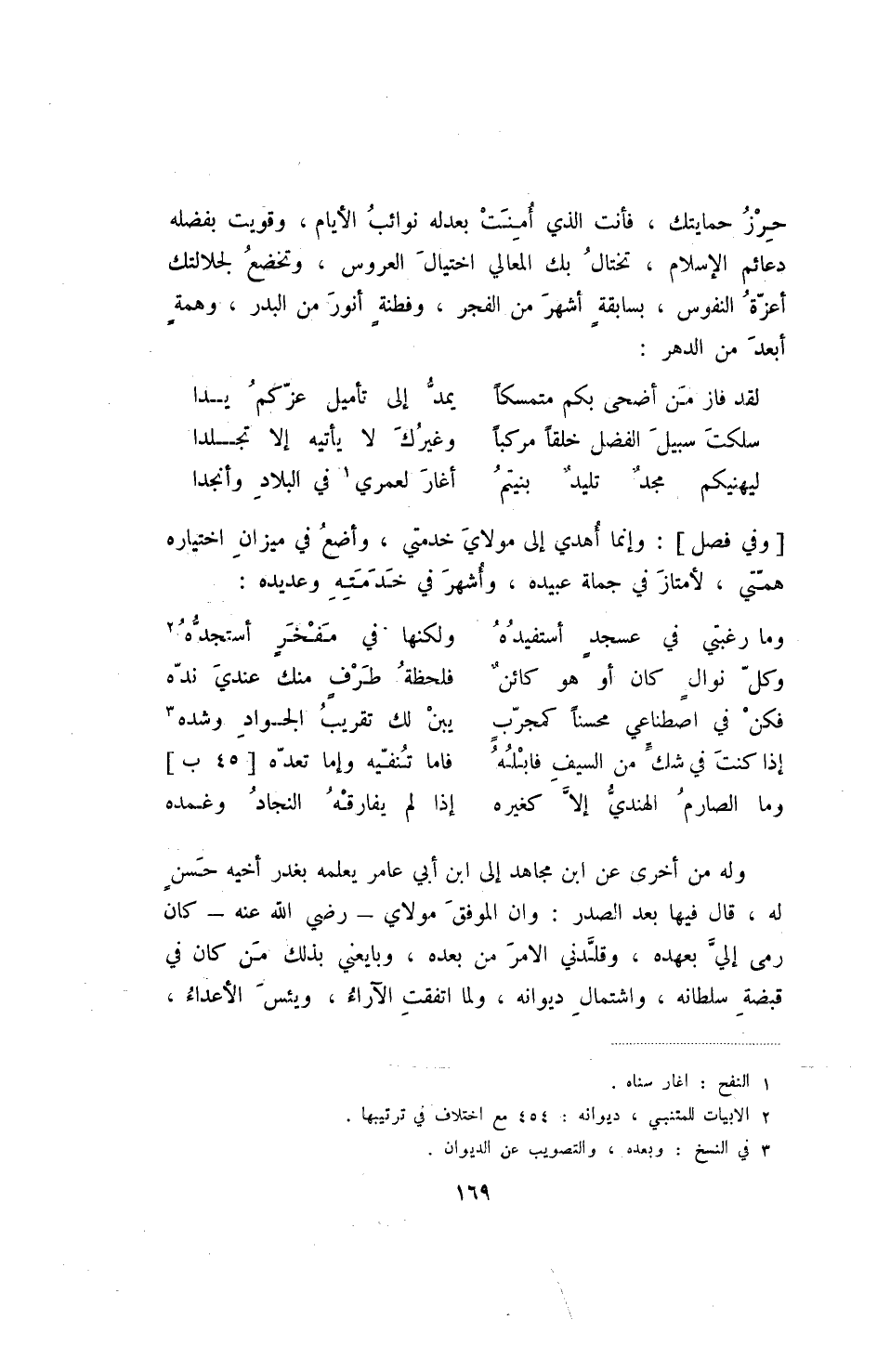حرز حمايتك، فأنت الذي أمنت بعدله نوائب الأيام، وقويت بفضله دعائم الإسلام، تختال بك المعالي اختيال العروس، وتخضع لجلالتك أعزة النفوس، بسابقة أشهر من الفجر، وفطنة أنور من البدر، وهمة أبعد من الدهر: