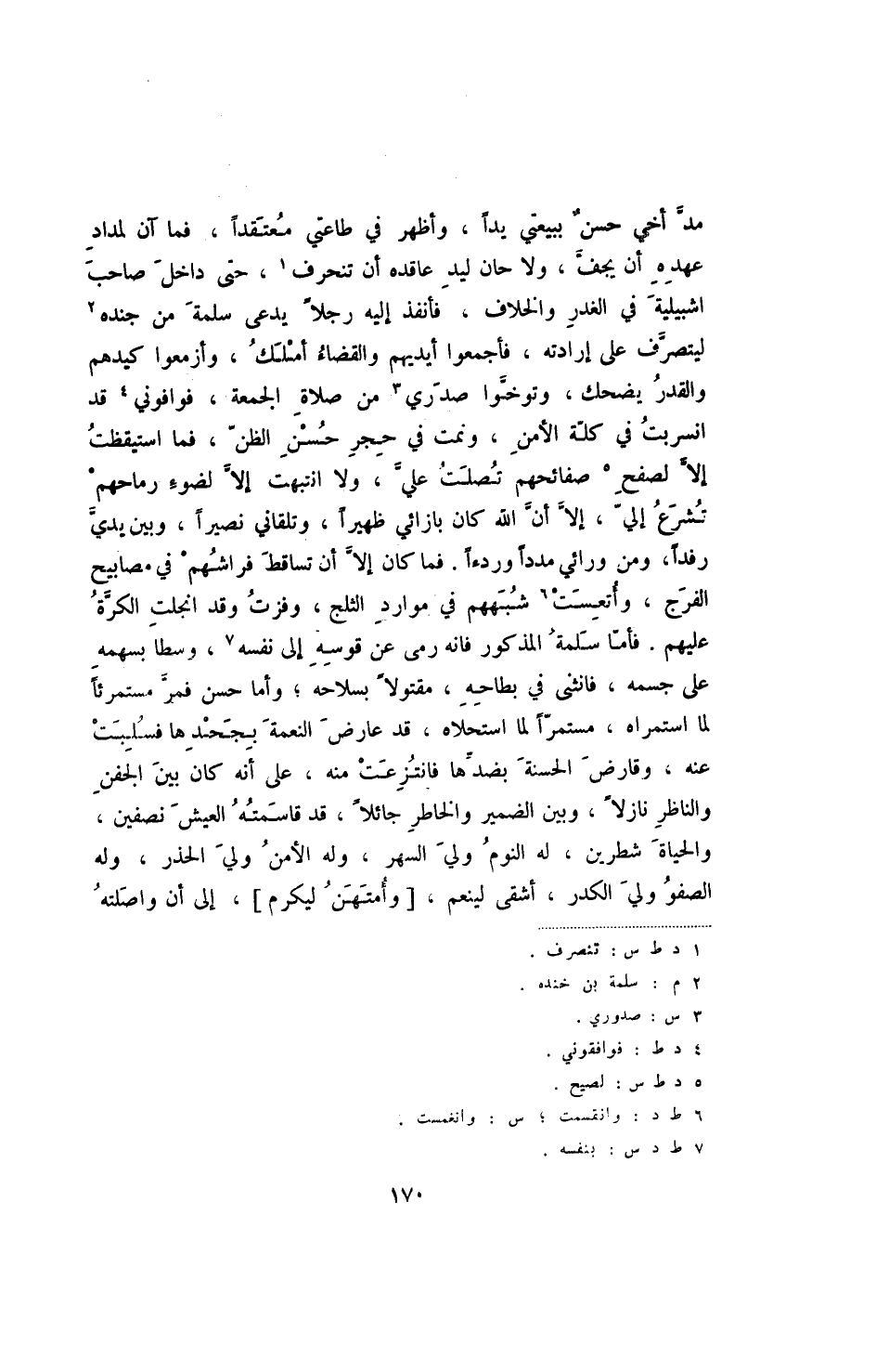 مد أخي حسن بيعتي يدا، وأظهر في طاعتي معتقدا، فما آن لمداد عهده أن يجف، ولا حان ليد عاقده أن تنحرف، حتى داخل صاحب اشبيلية في الغدر والخلاف، فأنفذ إليه رجلا يدعى سلمة من جنده ليتصرف على إرادته، فأجمعوا أيديهم والقضاء أملك، وأزمعوا كيدهم والقدر يضحك، وتوخوا صدري من صلاة الجمعة، فوافوني قد انسربت في كلة الأمن، ونمت في حجر حسن الظن، فما استيقظت إلا لصفح صفائحهم تصلت علي، ولا انتهبت إلا لضوء رماحهم تشرع إلي، إلا أن الله كان بازائي ظهيرا، وتلقاني نصيرا، وبين يدي رفدا، ومن ورائي مددا وردءا. فما كان إلا أن تساقط فراشهم في مصابيح الفرج، وأتسعت شبههم في موارد الثلج، وفزت وقد انجلت الكرة عليهم. فأما سلمة المذكور فانه رمى عن قوسه إلى نفسه، وسطا بسهمه على جسمه، فانثنى في بطاحه، مقتولا بسلاحه؛ وأما حسن فمر مستمرئا لما استمراه، مستمرا لما استحلاه، قد عارض النعمة بجحدها فسلبت عنه، وقارض الحسنة بضدها فانتزعت منه، على أنه كان بين الجفن والناظر نازلا، وبين الضمير والخاطر جائلا، قد قاسمته العيش نصفين، والحياة شطرين، له النوم ولي السهر، وله الأمن ولي الحذر، وله الصفو ولي الكدر، أشقى لينعم، [وأمتهن ليكرم] ، إلى أن واصلته