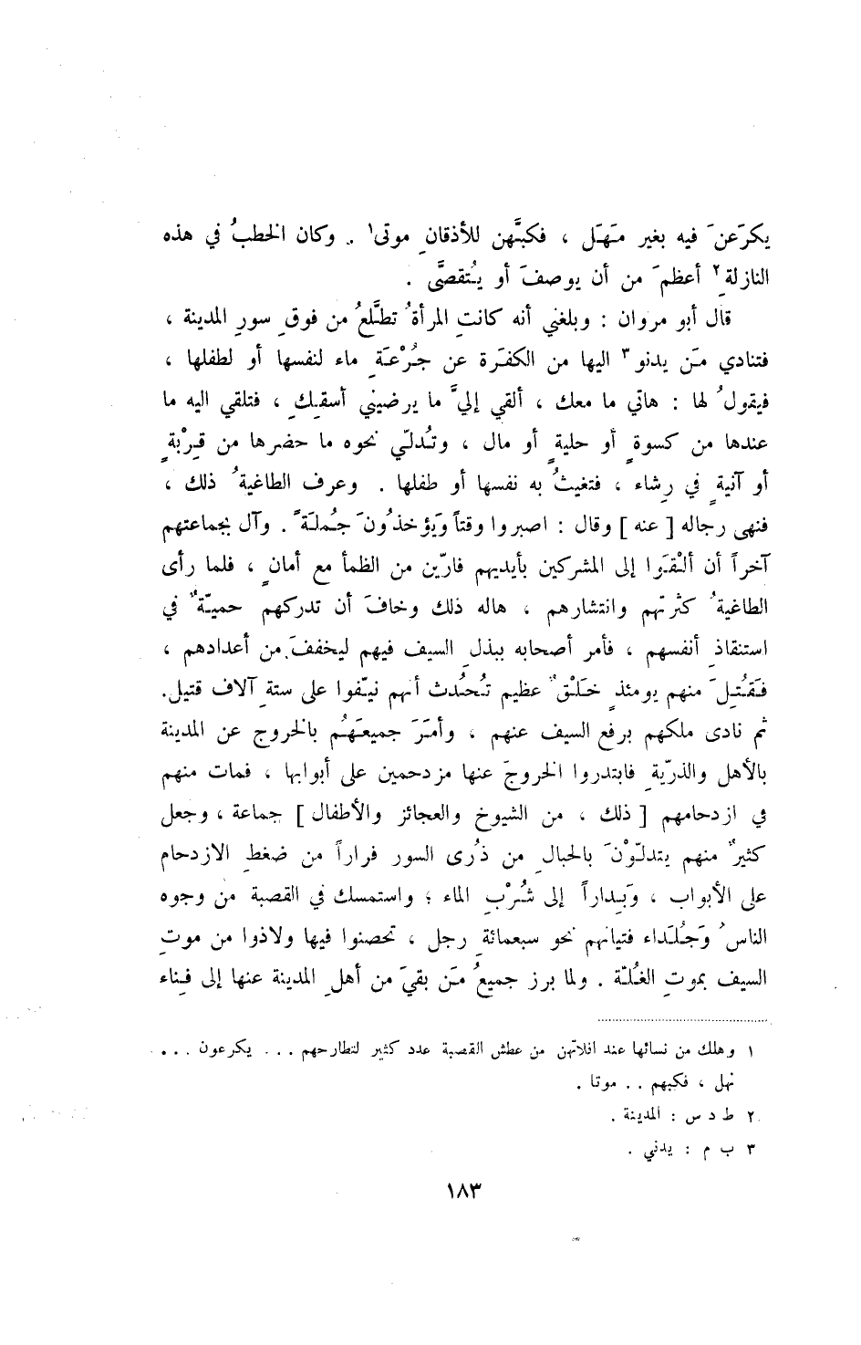 قال أبو مروان: وبلغني أنه كانت المرأة تطلع من فوق سور المدينة، فتنادي من يدنو اليها من الكفرة عن جرعة ماء لنفسها أو لطفلها، فيقول لها: هاتي ما معك، ألقي إلي ما يرضيني أسقك، فتلقي اليه ما عندها من كسوة أو حلية أو مال، وتدلي نحوه ما حضرها من قربة أو آنية في رشاء، فتغيث به نفسها أو طفلها. وعرف الطاغية ذلك، فنهى رجاله [عنه] وقال: اصبروا وقتا ويؤخذون جملة. وآل بجماعتهم آخرا أن ألقوا إلى المشركين بأيديهم فارين من الظمأ مع أمان، فلما رأى الطاغية كثرتهم وانتشارهم، هاله ذلك وخاف أن تدركهم حمية في استنقاذ أنفسهم، فأمر أصحابه ببذل السيف فيهم ليخفف من أعدادهم، فقتل منهم يومئذ خلق عظيم تحدث أنهم نيفوا على ستة آلاف قتيل. ثم نادى ملكهم برفع السيف عنهم، وأمر جميعهم بالخروج عن المدينة بالأهل والذرية فابتدروا الخروج عنها مزدحمين على أبوابها، فمات منهم في ازدحامهم [ذلك، من الشيوخ والعجائز والأطفال] جماعة، وجعل كثير منهم يتدلون بالحبال من ذرى السور فرارا من ضغط الازدحام على الأبواب، وبدارا إلى شرب الماء، واستمسك في القصبة من وجوه الناس وجلداء فتيانهم نحو سبعمائة رجل، تحصنوا فيها ولاذوا من موت السيف بموت الغلة. ولما برز جميع من بقي من أهل المدينة عنها إلى فناء