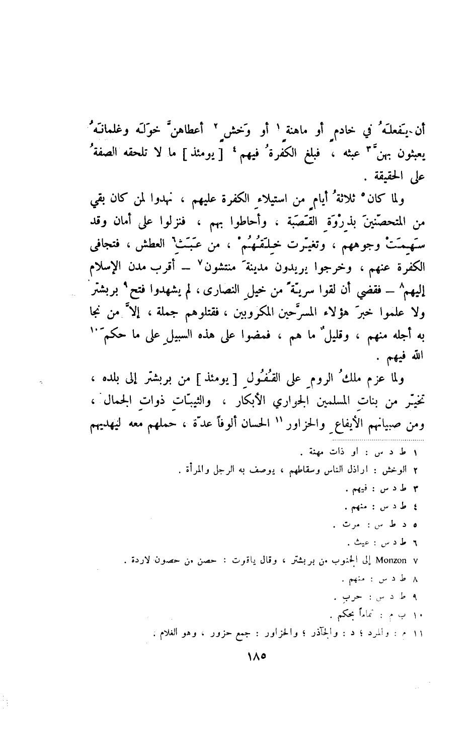 ولما عزم ملك الروم على القفول [يومئذ] من بربشتر إلى بلده، تخير من بنات لمسلمين الجواري الأبكار، والثيبات ذوات الجمال، ومن صبيانهم الأيفاع والحزاور الحسان ألوفا عدة، حملهم معه ليهديهم