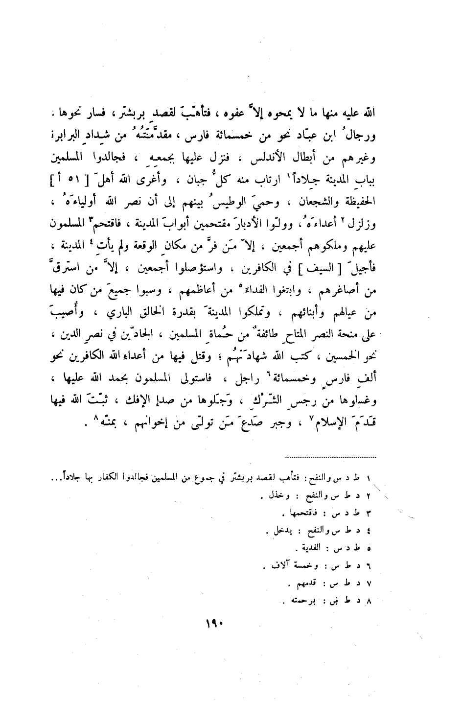 الله عليه منها ما لا يمحوه إلا عفوه، فتأهب لقصد بربشتر، فسار نحوها، ورجال ابن عباد نحو من خمسمائة فارس، مقدمته من شداد البرابرة وغيرهم من أبطال الأندلس، فنزل عليها بجمعه، فجالدوا المسلمين بباب المدينة جلادا ارتاب منه كل جبان، وأغوى الله أهل [51أ] الحفيظة والشجعان، وحمي الوطيس بينهم إلى أن نصر أوليائه، وزلزل أعداءه، وولوا الأدبار مقتحمين أبواب المدينة، فاقتحم المسلمون عليهم وملوكهم أجمعين، إلا من فر من مكان الوقعة ولم يأت المدينة، فأجيل [السيف] في الكافرين، واستوصلوا أجمعين، إلا من استرق من أصغارهم، وابتغوا الفداء من أعاظمهم، وسبوا جميع من كان فيها من عيالهم وأبنائهم، وتملكوا المدينة بقدرة الخالق الباري، وأصيب على منحة النصر المتاح طائفة من حماة المسلمين، الجادين في نصر الدين، نحو الخمسين، كتب الله شهادتهم؛ وقتل فيها من أعداء الله الكافرين نحو ألف فارس وخمسمائة راجل، فاستولى المسلمون بحمد الله عليها، وغسلوها من رجس الشرك، وجلوها من صدا الإفك، ثبت الله فيها قدم الإسلام، وجبر صدع من تولى من إخوانهم، بمنه.