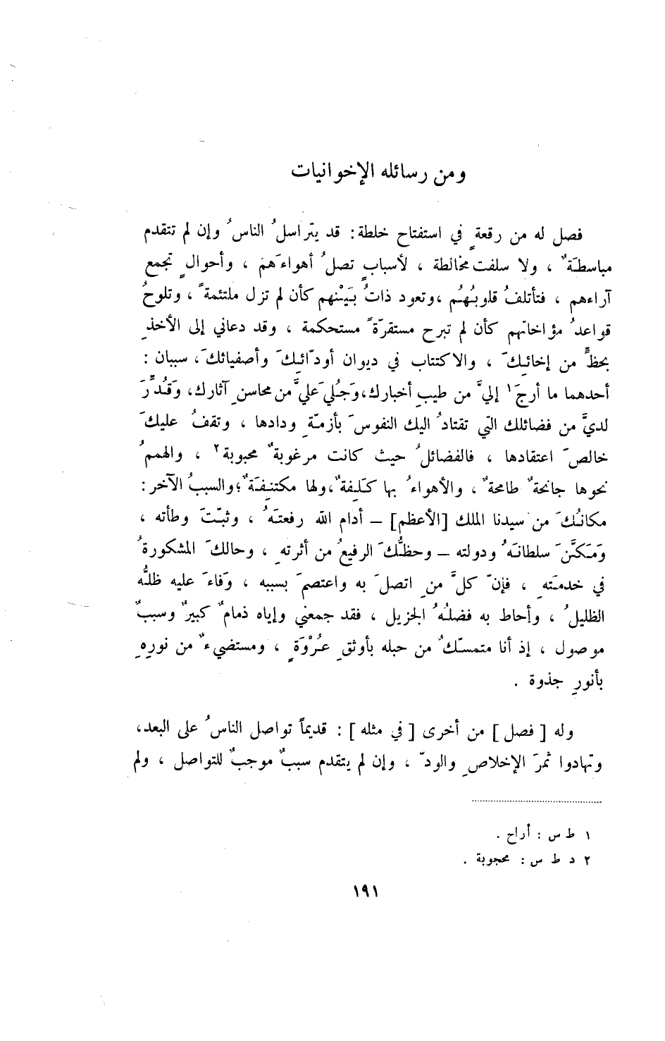 فصل له من رقعة في استفتاح خلطة: قد يتراسل الناس وإن لم تتقدم مباسطة، ولا سلف مخالطة، لأسباب تصل أهواءهم، وأحوال تجمع آراءهم، فتأتلف قلوبهم، وتعود ذات بينهم كأن لم تزل ملتئمة، وتلوح قواعد مؤاخاتهم كأن لم تبرح مستقرة مستحكمة، وقد دعاني إلى الأخذ بحظ من إخائك، والاكتئاب في ديوان أودائك وأصفيائك، سببان: أحدهما ما أرج إلي من طيب أخبارك، وجلي علي من محاسن آثارك، وقدر لدي من فضائلك التي تقاد اليك النفوس بأزمة ودادها، وتقف عليك خالص اعتقادها، فالفضائل حيث كانت مرغوبة محبوبة، والهمم نحوها جانحة طامحة، والأهواء بها كلفة، ولها مكتنفة؛ والسبب الآخر: مكانك من سيدنا الملك [الأعظم]- أدام الله رفعته، وثبت وطأته، ومكن سلطانه ودولته - وحظك الرفيع من أثرته، وحالك المشكورة في خدمته، فإن كل من اتصل به واعتصم بسببه، وفاء عليه ظله الظليل، وأحاط به فضله الجزيل، فقد جمعني وإياه ذمام كبير وسبب موصول، إذ أنا متمسك من حبله بأوثق عروة، ومستضيء من نوره بأنور جذوة.