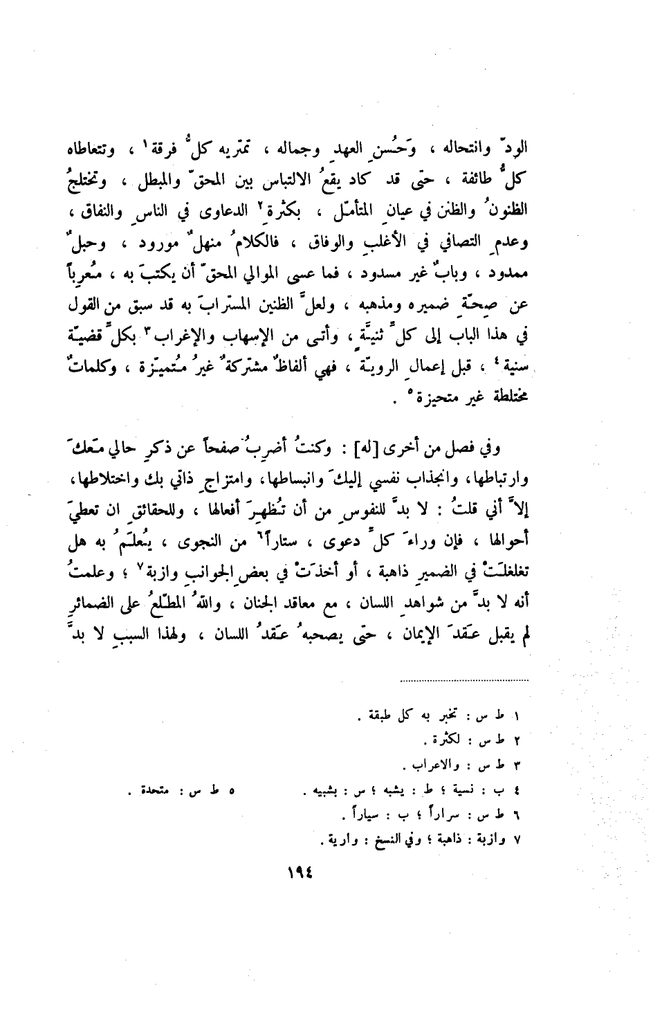وفي فصل من أخرى [له] : وكنت أضرب صفحا عن ذكر حالي معك والاتباطها، وانجذاب نفسي إليك وانبساطها، وامتزاج ذاتي بك واختلاطها، إلا أني قلت: لا بد للنفوس من أن تظهر ألإعالها، وللحقائق ان تعطي أحوالها، فإن وراء كل دعوى، ستارا من النجوى، يعلم به هل تغلغلت في الضمير ذاهبة، أو أخذت في بعض الجوانب وازبة؛ وعلمت أنه لا بد من شواهد اللسان، مع معاقد الجنان، والله المطلع على الضمائر لم يقبل عقد الإيمان، حتى يصحبه عقد اللسان، ولهذا السبب لا بد