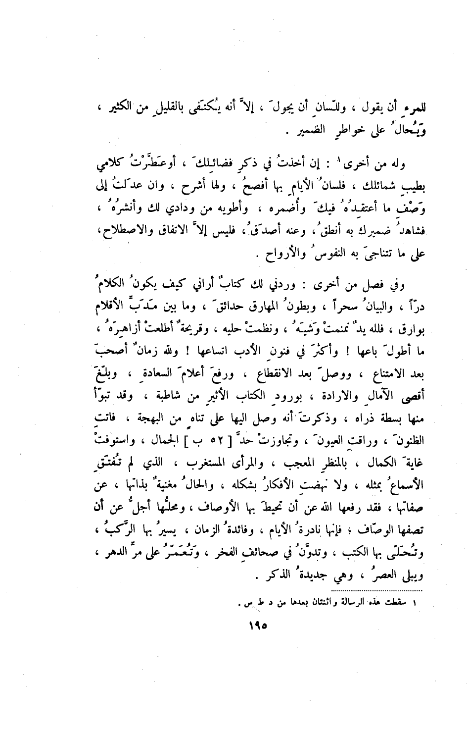 وله من أخرى: إن أخذت في ذكر فضائلك، أو عطرت كلامي بطيب شمائلك، فلسان الأيام بها أفصح، ولها أشرح، وان عدلت إلى وصف ما أعتقده فيك وأضمره، وأطويه من ودادي لك وأنشره، فشاهد ضميرك به أنطق، وعنه أصدق، فليس إلا الاتفاق والاصطلاح، على ما تتناخى به النفوس والأرواح.