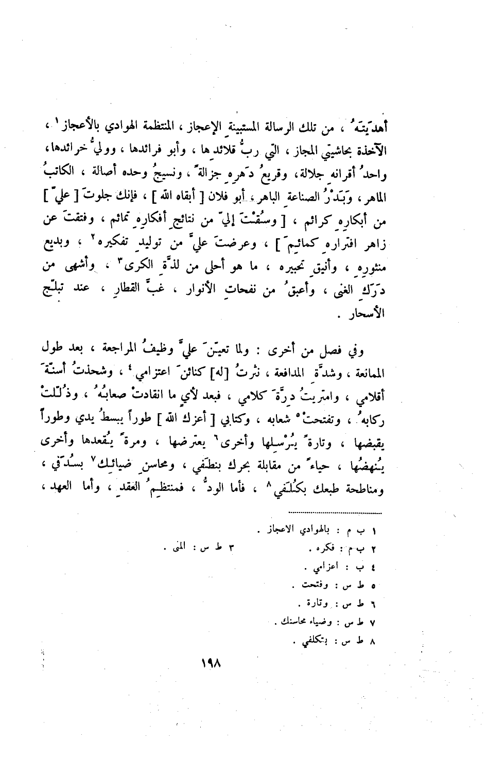 أهديته، من تلك الرسالة المستبينة الإعجاز، المنتظمة الهوادي بالإعجاز، الآخذة بحاشيتي المجاز، التي رب قلائدها، وأبو فرائدها، وولي خرائدها، واحد أقرانه جلالة، وقريع دهره جزالة، ونسيج وحده أصالة، الكاتب الماهر، وبدر الصناعة الباهر، أبو فلان [ابقاه الله] ، فإنك جلوت [علي] من أبكاره كرائم، [وسقت إلي من نتائج أفكاره تمائم، وفتقت عن زاهر افتراره كمائم] ، وعرضت علي من توليد تفكيره، وبديع منثوره، وأنيق تحبيره، ما هو أحلى من لذة الكرى، وأشهى من درك الغنى، وأعبق من نفحات الأنوار، غب القطار، عند تبلج الأسحار.