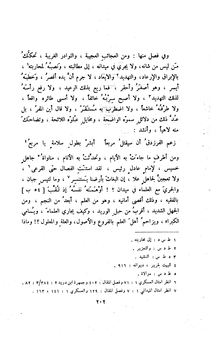 وهو في فصل منها: ومن العجائب العجيبة، والنوادر الغريبة، تحكك من ليس من شانه، ولا يجري في ميدانه، إلى مطالبته، ونصبه لمحاربته، بالإبراق وللإرعاد، والتهديد والايعاد، لا جرم أن يده أقصر، وخطبه أيسر، وهو أصغر وأحقر، فما ريع بذلك الوعيد، ولا رأسه لذلك التهديد، ولا أصبح سربه خائفا، ولا أمسى طائره واقعا، ولا طرفه خاشعا، ولا اضطرب به مستقر، ولا قال أين المفر، بل عد ذلك من دلائل سموه الواضحة، ومخايل علوة اللائحة، وتضاحك منه لاهيا، وأنشد: