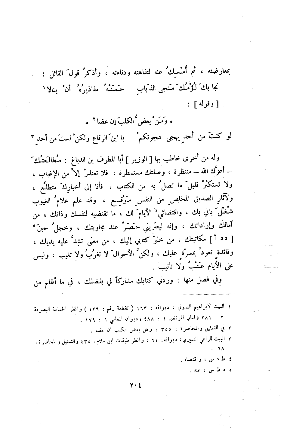 وله من أخرى خاطب بها [الوزير] أبا المطرف بن الدباغ: مطالعتك - أعزك الله - منتظره، وصلتك مستمطرة، فلا تعتذر إلا من الإغباب، ولا تستكثر قليل ما تصل به من الكتاب، فأنا إلى أخبارك متطلع، ولآثار الصديق المخلص من النفس موقع، وقد علم علام الغيوب شغل بالي بك، واقتضائي الأيام لك، ما تقتضيه لنفسك وذاتك، من آمالك وإرادتك، وإنه ليعتريني حصر عند مجاوبتك، وخجل حين [55!] مكاتبتك، من خلو كتابي إليك، من معنى تشد عليه يديك، وفائدة تعود بمسرة عليك، ولكن الأحوال لا تغرب ولا تغيب، وليس على الأيام عتب ولا تأنيب.
