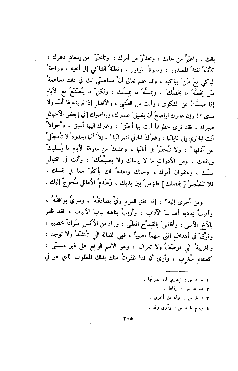 بالك، واغتم من حالك، وتعذر من أمرك، وتأخر من إسعاد دهرك، كأنه نفثة المصدور، وسلوة الموتور، وتعلة الشاكس إلى أخيه، وراحة الباكي مع من يباكيه، وقد علم تعالى أن مساهمي لك في ذلك مساهمة من يخصه ما يخصك، ويمسه ما يمسك، ولكن ما يصنع مع الأيام إذا صمت عن الشكوى، وأبت من العتبى، والأقدار إذا لم ينته لها أمد ولا مدى -! وإن عذرك لواضح أن يضيق صدرك، ويعاصيك [في] بعض الأحيان صبرك، فقد ترى حظوظا أنت بها أحق، وغيرك اليها أسبق، وأحوالا أنت الجاري إلى غاياتها، وغيرك الجاني لثمراتها، إلا أنها الجدود لا تعجل عن آنائها، ولا تحفز في أناتها، وعندك من معرفة الأيام ما يسليك وينفعك، ومن الأدوات ما لا يهملك ولا يضيعك، وأنت في اقتبال سنك، وعنفوان أمرك، وحالك واعدة لك بأكثر مما نفسك، فلا تضجر [بفضلك] فالزمن بين يديك، وعدم الأمائل محوج إليك.