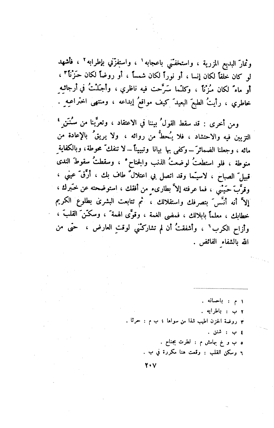 وثمار البديع المزرية، واستخفني باعجابه، واستفزني بإطرابه، فأشهد لو كان خلقا لكان إنسا، أو نورا لكان شمسا، أو روضا لكان حزنا، أو ماء لكان مزنا، وكلما سرحت فيه ناظري، وأجلت في أرجائه خاطري، رأيت الطبع البعيد كيف مواقع إبداعه، ومنتهى اختراعه.