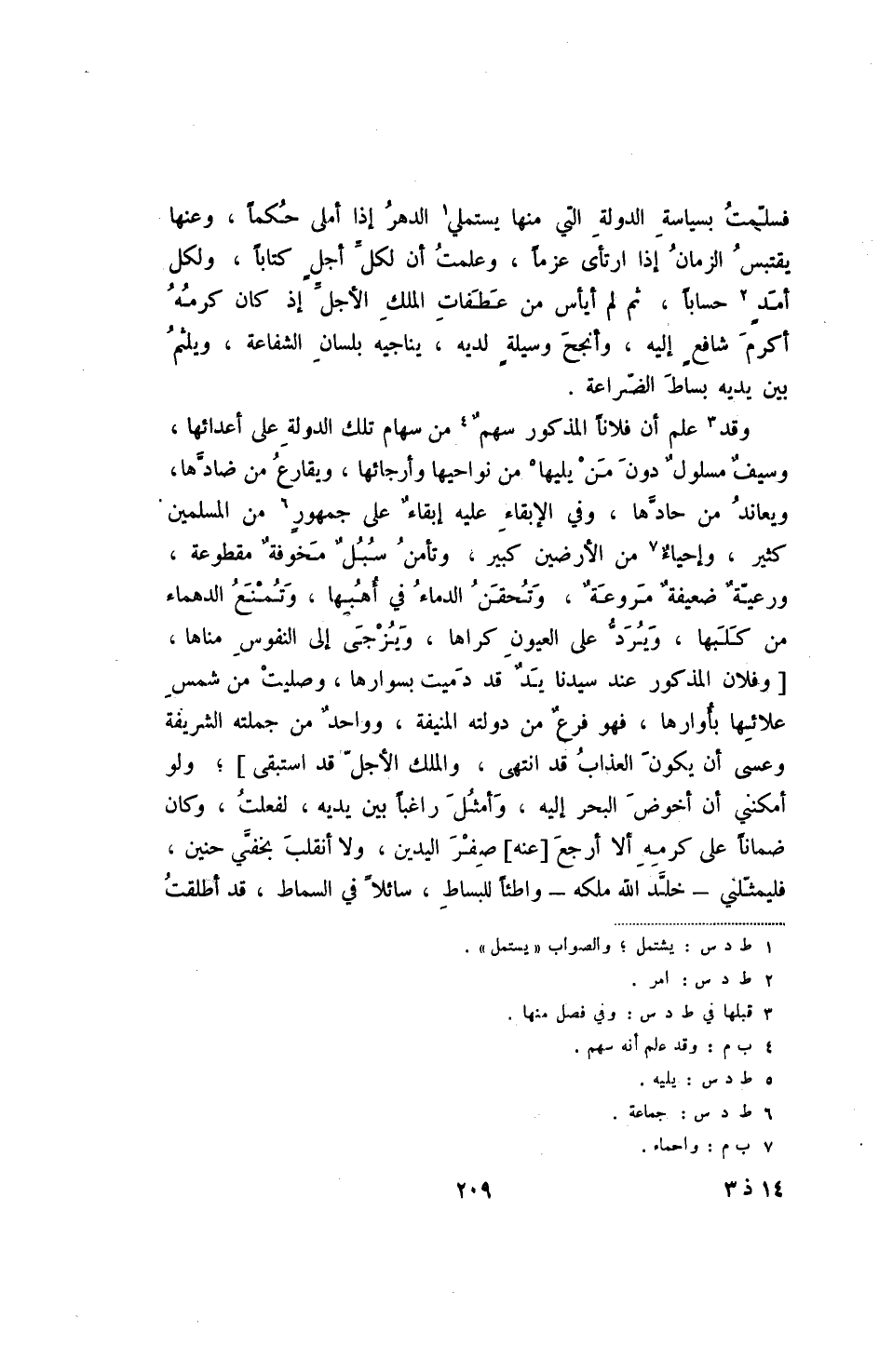 فسلمت بسياسة الدولة التي منها يستملي الدهر إذا أملى حكما، وعنها يقتبس الزمان إذا ارتأى عزما، وعلمت أن لكل أجل كتابا، ولكل أمد حسابا، ثم لم أيأس من عطفات الملك الأجل إذ كان كرمه اكرم شافع إليه، وانجح وسيلة لديه، يناجيه بلسان الشفاعة، ويلم بين يديه بساط الضراعة.