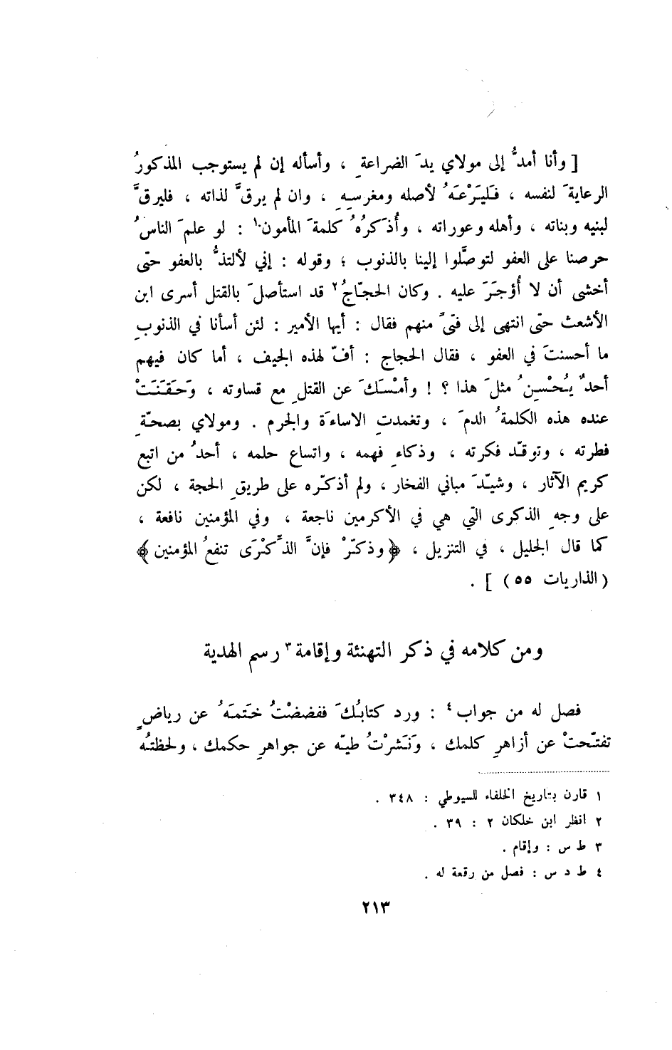 [وأنا أمد إلى مولاي يد الضراعة، وأسأله إن لم يستوجب المذكور الرعاية لنفسه، فليرعه لأصله ومغرسه، وان لم يرق لذاته، فليرق لبنيه وبناته، وأهله وعوراته، وأذكره كلمة المأمون: لو علم الناس حرصنا على العفو لتوصلوا إلينا بالذنوب؛ وقوله: إني لأتلذ بالعفو حتى أخشى أن لا أؤجر عليه. وكان الحجاج قد استأصل بالقتل أسرى ابن الأشعث حتى انتهى إلى فتى منهم فقال: أيها الأمير: لئن أسأنا في الذنوب ما أحسنت في العفو، فقال الحجاج: أف لهذه الجيف، أما كان فيهم أحد يحسن مثل هذا -! وأمسك عن القتل مع قساوته، وحقنت عنده هذه الكلمة الدم، وتغمدت الاساءة والجرم. ومولاي بصحة فطرته، وتوقد فكرته، وذكاء فهمه، واتساع حلمه، أحد من اتبع كريم الآثار، وشيد مباني الفخار، ولم أذكره على طريق الحجة، لكن على وجه الذكرى التي هي في الأكرمين ناجعة، وفي المؤمنين نافعة، كما قال الجليل، في التنزيل، (وذكر فإن الذكرى تنفع المؤمنين) (الذاريات 55) ] .