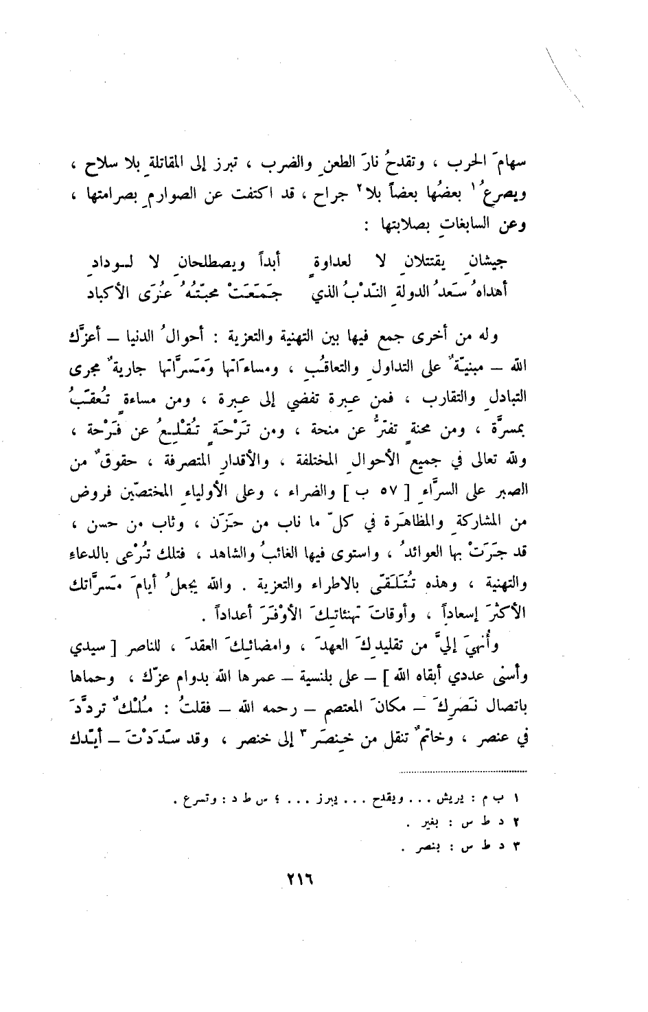 أهداه سعد الدولة الندب الذي ... جمعت محبته عرى الأكباد وله من أخرى جمع فيها بين التهنية والتعزية: أحوال الدنيا - أعزك الله - مبنية على التداول والتعاقب، ومساءاتها ومسراتها جارية مجرى التبادل والتقارب، فمن عبرة تفضي إلى عبرة، ومن مساءة تعقب بمسرة، ومن محنة تفتر عن منحة، ومن ترحة تقلع عن فرحة، ولله تعالى في جميع الأحوال المختلفة، والأقدار المتصرفة، حقوق من الصبر على السراء [57 ب] والضراء، وعلى الأولياء المختصين فروض من المشاركة والمظاهرة في كل ما ناب من حزن، وثاب من حسن، قد جرت بها العوائد، واستوى فيها الغائب والشاهد، فتلك ترعى بالدعاء والتهنية، وهذه تتلقى باطراء والتعزية. والله يجعل أيام مسراتك الأكثر إسعادا، وأوقات تهنئاتك الأوفر أعدادا.