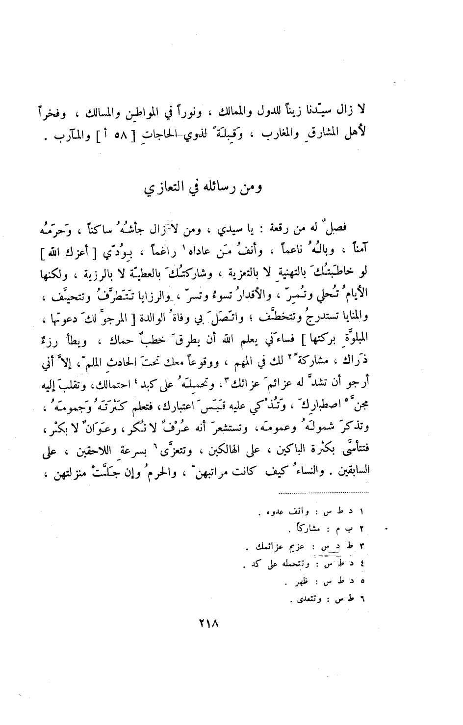 فصل له من رقعة: يا سيدي، ومن لا زال جأشه ساكنا، وحرمه آمنا، وباله ناعما، وأنف من عاداه راغما، بودي [أعزك الله] لو خاطبتك بالتهنية لا بالتعزية، وشاركتك بالعطية لا بالرزية، ولكنها الأيام تحلي وتمر، والأقدار تسوء وتسر، والرزايا تتطرف وتتحيف، والمنايا تستدرج وتتخطف؛ واتصل بي وفاة الوالدة [المرجو لك دعوتها، المبلوة بركتها] فساءني يعلم الله أن يطرق خطب حماك، ويطأ رزء ذراك، مشاركة لك في المهم، ووقوعا معك تحت الحادث الملم، إلا أني أرجو أن تشد له عزائم عزائك، وتحمله على كبد احتمالك، وتقلب إليه مجن اصطبارك، وتذكي علبه قبس اعتبارك، فتعلم كثرته وجموحه، وتذكر شموله وعمومه، وتستشعر أنه عرف لا نكر، وعوان لا بكر، فتتأسى بكثرة الباكين، على الهالكين، وتتعزى بسرعة اللاحقين، على السابقين. والنساء كيف كانت مراتبهن، والحرم وإن جلت منزلتهن