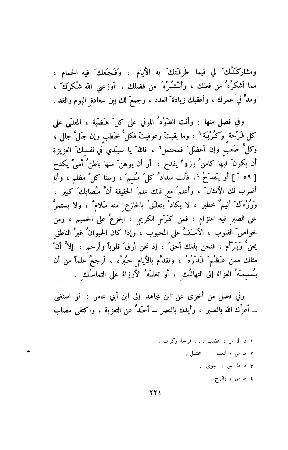 ومشاركتك لي فيما طرقتك به الأيام، وفجعك فيه الحمام، مما أشكره من فعلك، وأنشره من فضلك، أوزعني الله شكرك، ومد في عمرك، وأعقبك زيادة العدد، وجمع لك بين سعادة اليوم والغد،