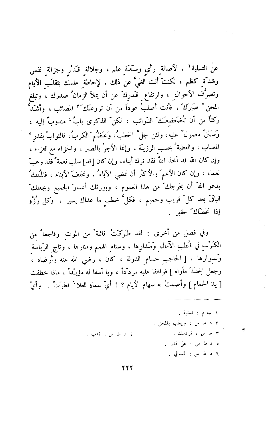 عن التسلية لأصالة رأي وسعة علم، وجلالة قدر وجزالة نفس وشدة كظم، ولكنت أنت الغني عن ذلك، لإحاطة علمك بتقلب الأيام وتصرف الأحوال، وارتفاع قدرك عن أن يملأ الزمان صدرك، وتبلغ المحن صبرك، فأنت أصلب عودا من أن تروعك المصائب، وأشد ركنا من أن تضعضعك النوائب، لكن الذكرى باب مندوب إليه، وسنن معمول عليه، ولئن جل الخطب، وعظم الكرب، فالثواب بقدر المصاب، والعطية بحسب الرزية، وإنما الأجر بالصبر، والجزاء مع العزاء، وإن كان الله قد أخذ ابنا فقد ترك أبناء، وإن كان [قد] سلب نعمة فقد وهب نعماء، وإن كان الأعم والأكثر أن تمضي الآباء، وتخلف الأبناء، فالملك يدعو الله أن يخرجك من هذا العموم، ويورثك أعمار الجميع ويجعلك الباقي بعد قريب وحميم، فكل خطب ما عداك يسير، وكل رزء إذا تخطاك حقير.