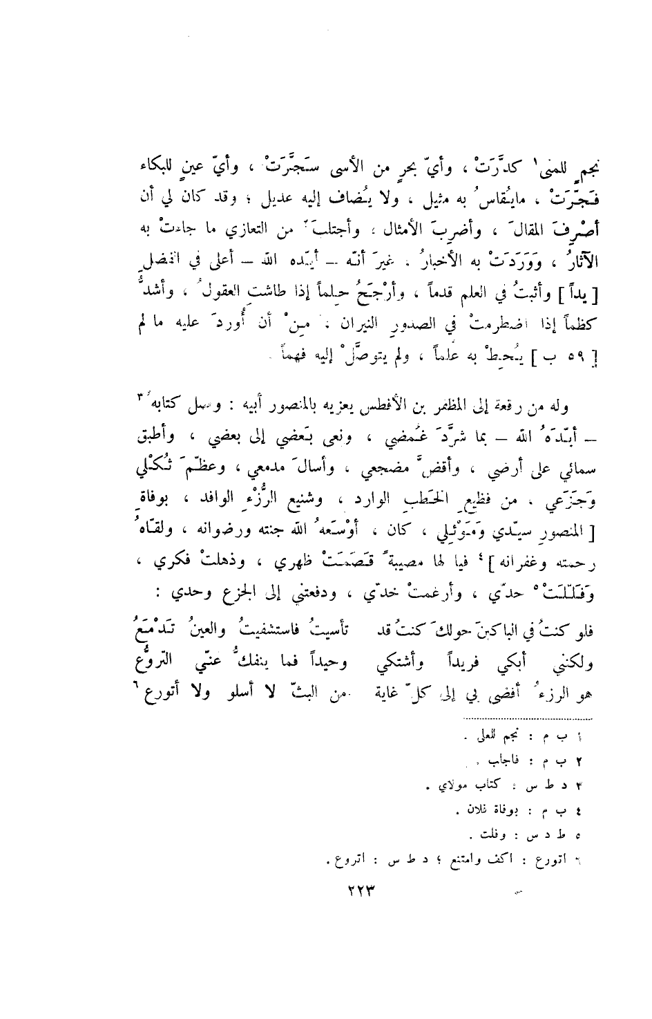 نجم للمنى كدرت، وأي بحر من الأسى سجرت، وأي عين للبكاء فجرت، ما يقاس به مثيل، ولا يضاف إليه عديل؛ وقد كان لي أن أصرف المقال، وأضرب الأمثال، وأجتلب من التعزي ما جاءت به الآثار، ووردت به الأخبار، غير أنه - أيده الله - أعلى في الفضل [يدا] وأثبت في العلم قدما، وأرجح حلما إذا طاشت العقول، وأشد كظما إذا اضطرمت في الصدور النيران، من أن أورد عليه ما لم [59 ب] يحط علما، ولم يتوصل إليه فهما.