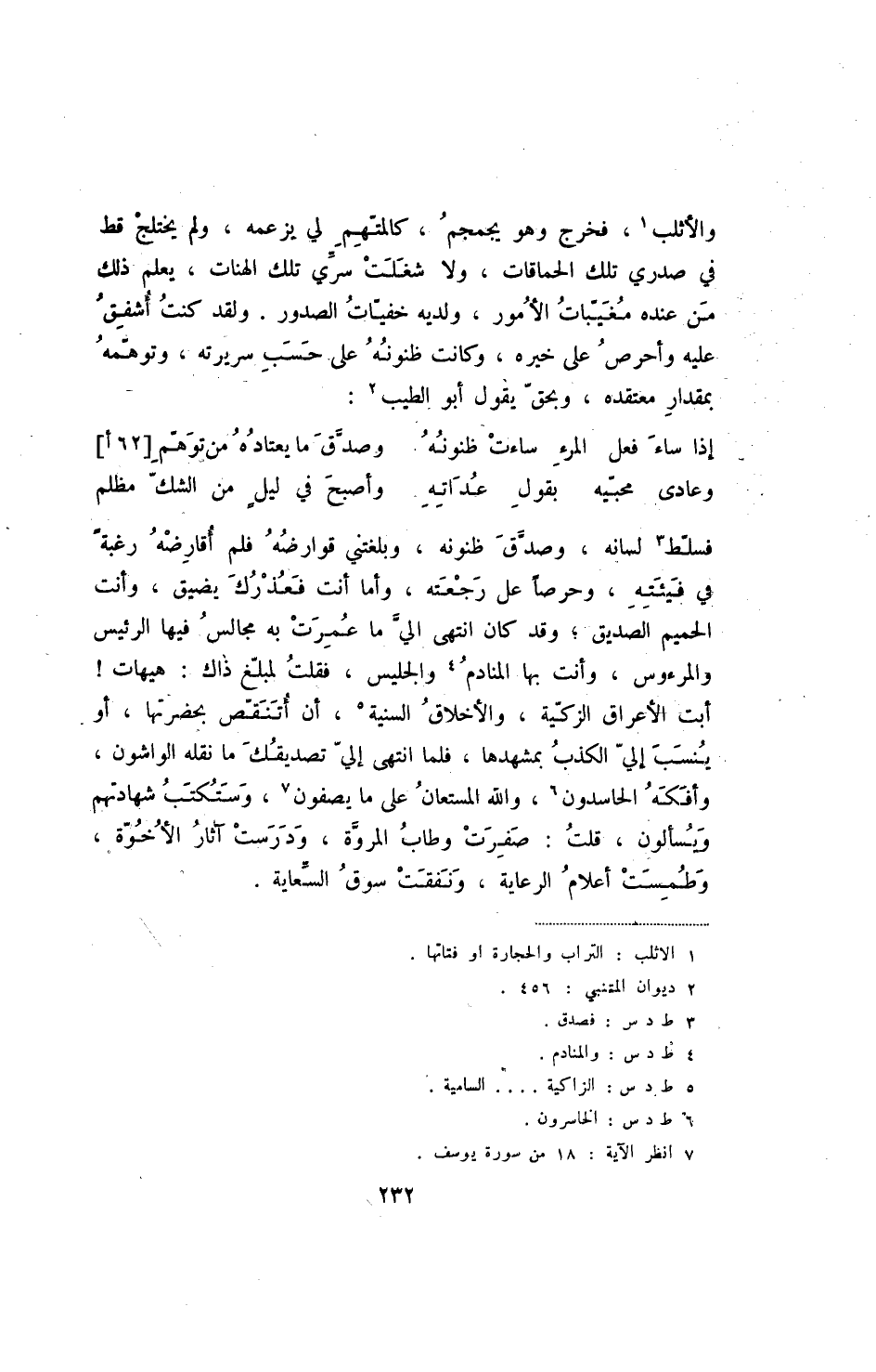 والأثلب، فخرج وهو يجمجم، كالمتهم لي بزعمه، ولم يختلج قط في صدري تلك الحماقات، ولا شغلت سري تلك الهنات، يعلم ذلك من عنده مغيبات الأمور، ولديه خفيات الصدور. ولقد كنت أشفق عليه وأحرص على خيره، وكانت ظنونه على حسب سريرته، وتوهمه بمقدار معتقده، وبحق يقول أبو الطيب: