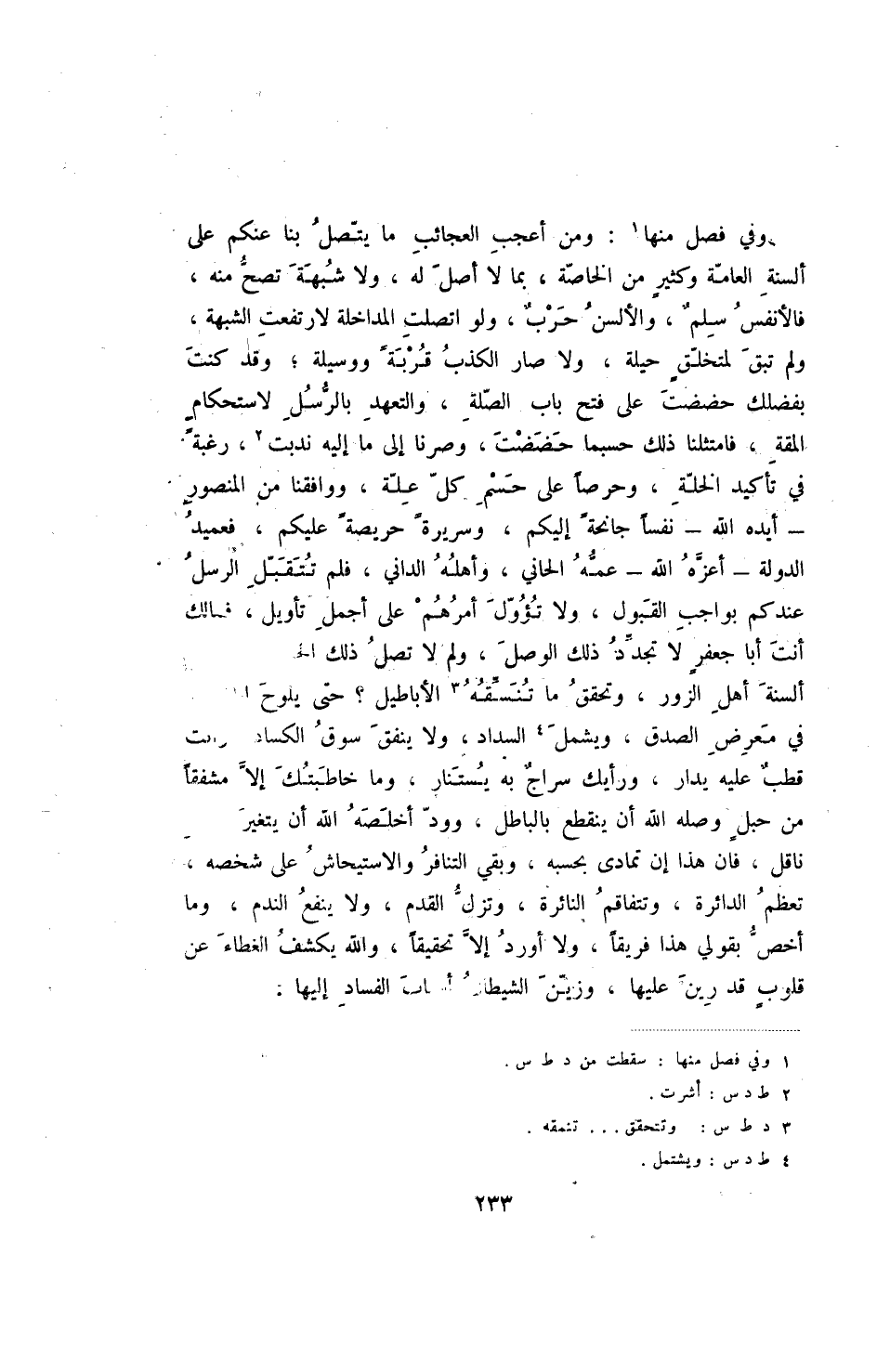 وفي فصل منها: ومن أعجب العجائب ما يتصل بنا عنكم على ألسنة العامة وكثير من الخاصة، لا أصل له، ولا شبهة تصح منه، فالأنفس سلم، والألسن حرب، ولو اتصلت المداخلة لارتفعت الشبهة، ولم تبق لنتخلق حيلة، ولا صار الكذب قربة ووسيلة؛ وقد كنت بفضلك حضضت على فتح باب الصلة، والتعهد بالرسل لاستحكام المقة، فامتثلنا ذلك حسبما حضضت، وصرنا إلى ما إليه ندبت، رغبة في تأكيد الخلة، وحرصا على حسم كل علة، ووافقنا من المنصور - أيده الله - نفسا جانحة إليكم، وسريرة حريصة عليكم، فعميد الدولة - أعزه الله - عمه الحاني، وأهله الداني، فلم تتقبل الرسل عندكم بواجب القبول، ولا تؤول أمرهم على أجمل تأويل، فمالك أنت أبا جعفر لا تجدد ذلك الوصل، ولم لا تصل ذلك الحبل، وتقطع ألسنة أهل الزور، وتحقق ما تنسقه الأباطيل - حتى يلوح الحق، في معرض الصدق، ويشمل السداد، ولا ينفق سوق الكساد؛ وأنت قطب عليه يدار، ورأيك سراج به يستنار، وما خاطبتك إلا مشفقا من حبل وصله الله أن ينقطع بالباطل، وود أخلصه الله أن يتغير بقول ناقل، فان هذا إن تمادى بحسبه، وبقي التنافر والاستيحاش على شخصه، تعظم الدائرة، وتتفاقم النائرة، وتزل القدم، ولا ينفع الندم، وما أخص بقولي هذا فريقا، ولا أورد إلا تحقيقا، والله يكشف الغطاء عن قلوب قد رين عليها، وزين الشيطان أسباب الفساد إليها: