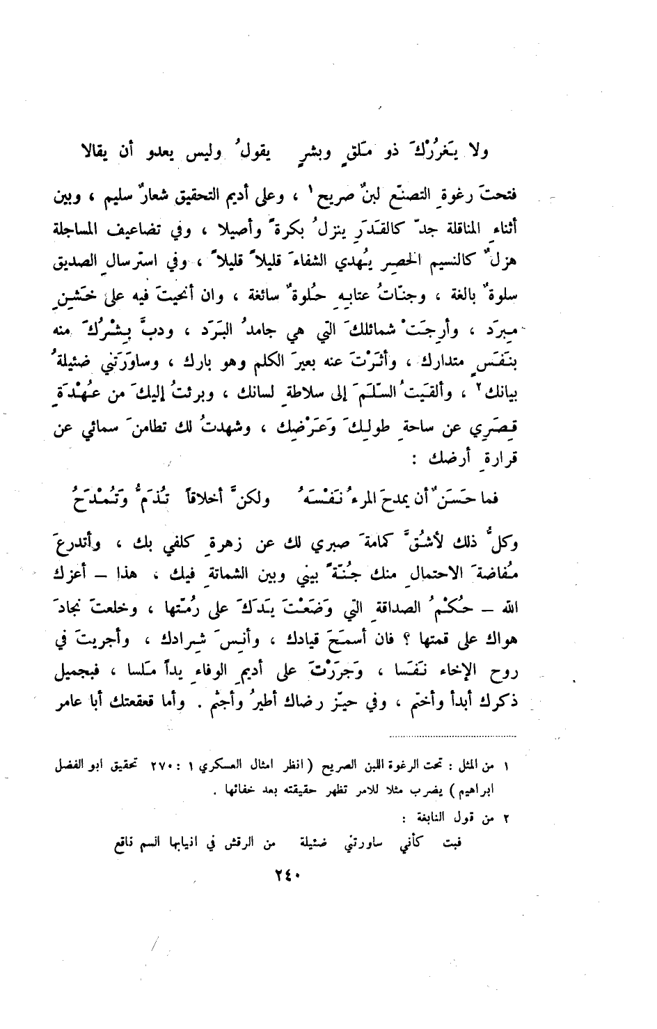 ولا يغررك ذو ملق وبشر ... يقول وليس يعدو أن يقالا فتحت رغوة التصنع لبن صريح، وعلى أديم التحقيق شعار سليم، وبين أثناء المناقلة جد كالقدر ينزل بكرة وأصيلا، وفي تضاعيف المساجلة هزل كالنسيم الخصر يهدي الشفاء قليلا قليلا، وفي استرسال الصديق سلوة بالغة، وجنات عتابه حلوة سائغة، وان أنحيت فيه على خشن مبرد، وأرجحت شمائلك التي هي جامد البرد، ودب بشرك منه بنفس متدارك، وأثرت عنه بغير الكلم وهو بارك، وساورتني ضئيلة بيانك، وألقيت السلم إلى سلاطة لسانك، وبرئت إليك من عهدة قصري عن ساحة طولك وعرضك، وشهدت لك تطامن سمائي عن قرارة أرضك: