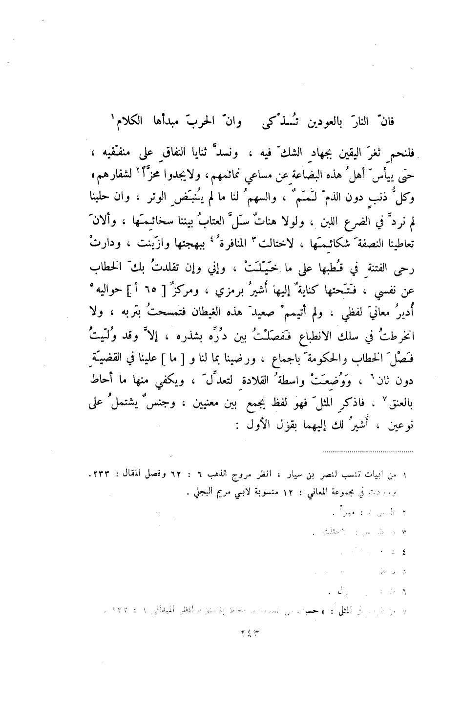 فلنحم ثغر اليقين بجهاد الشك فيه، ونسد ثنايا النفاق على منفقيه، حتى ييأس أهل هذه البضاعة عن مساعي نمائمهم، ولا يجدوا محزا لشفارهم، وكل ذنب دون الذم لمم، والسهم لنا ما لم ينبض الوتر، وان حلبنا لم نرد في الضرع اللبن، ولولا هنات سل العتاب بيننا سخائمها، وألان تعاطينا النصفة شكائمها، لاختالت المنافرة ببهجتها وازينت، ودارت رحى الفتنة في قطبها على ما خيلت، وإني وإن تقلدت بك الخطاب عن نفسي، فتحتها كناية إليها أشير برمزي، ومركز [65 أ] حواليه أدير معاني لفظي، ولم أتيمم صعيد هذه الغيظان فنمسحت بتربه، ولا انخرطت في سلك الانطباع ففضلت بين دره بشذره، إلا وقد وليت فصل الخطاب والحكومة باجماع، ورضينا بما لنا و [ما] علينا في القضية دون ثان، ووضعت واسطة القلادة لتعدل، ويكفي منها ما أحاط بالعنق، فاذكر المثل فهو لفظ يجمع بين معنيين، وجنس يشتمل على نوعين، أشير لك إليهما بقول الأول: