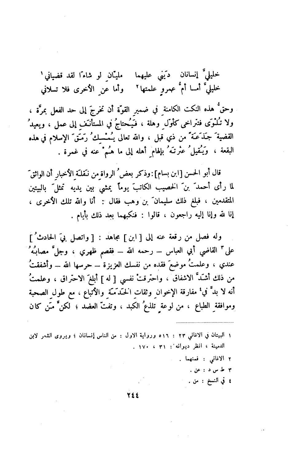 قال أبو الحسن [ابن بسام] : وذكر بعض الرواة من نقلة الأخبار أن الواثق لما رأى أحمد بن الخصيب الكاتب يوما يمشي بين يديه تمثل بالبيتين المتقدمين، فبلغ ذلك سليمان بن وهب فقال: أنا والله تلك الأخرى، إنا لله وإنا إليه راجعون، قالوا: فنكبهما بعد ذلك بأيام.