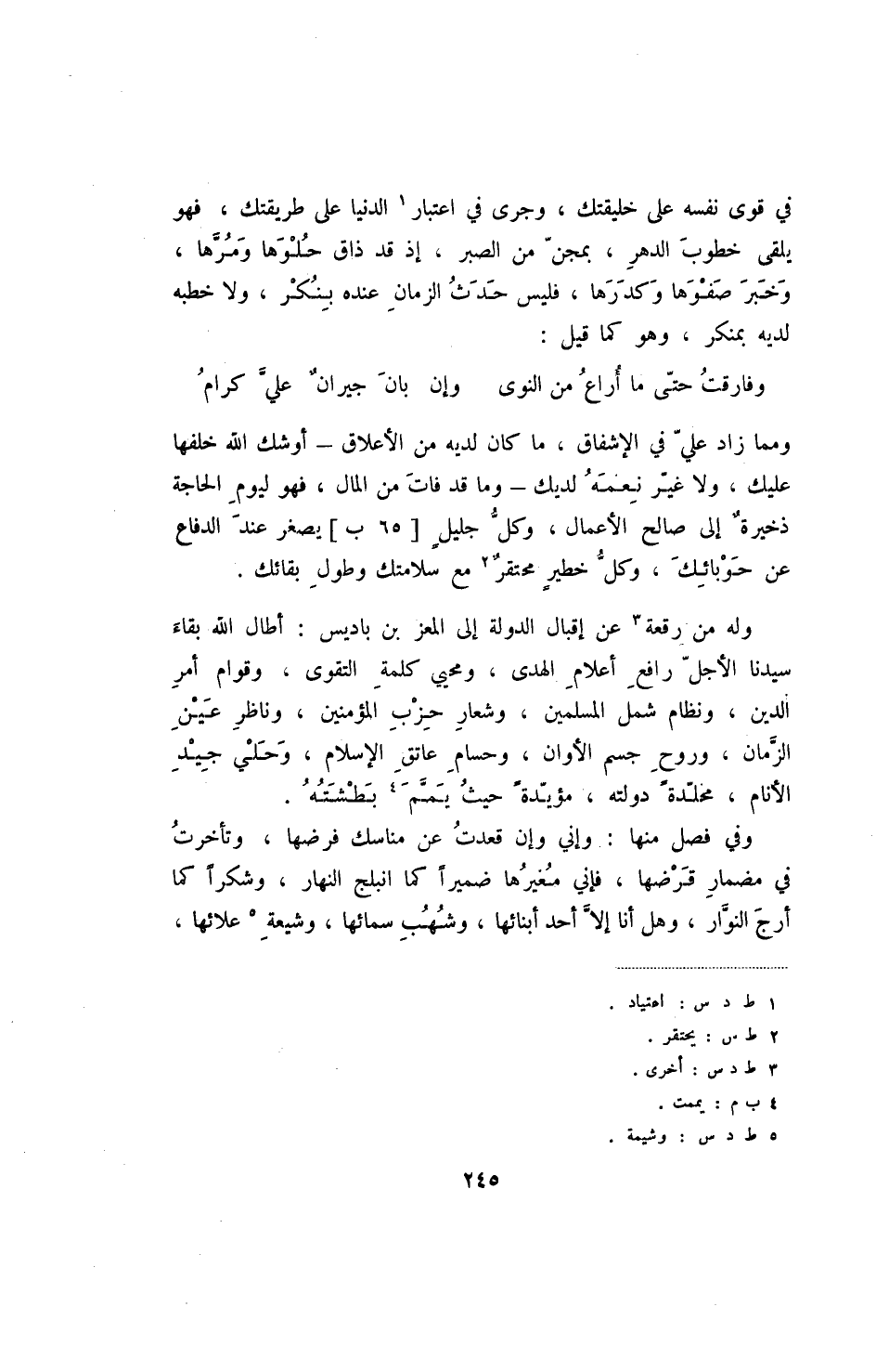 وله من رقعة عن إقبال الدولة إلى المعز بن باديس: أطال الله بقاء سيدنا الأجل رافع أعلام الهدى، ومحيي كلمة التقوى، وقوام أمر الدين، ونظام شمل المسلمين، وشعار حزب المؤمنين، وناظر عين الزمان، وروح جسم الأوان، وحسام عاتق الإسلام، وحلي جيد الأنام، مخلدة دولته، مؤيدة حيث يمم بطشته.