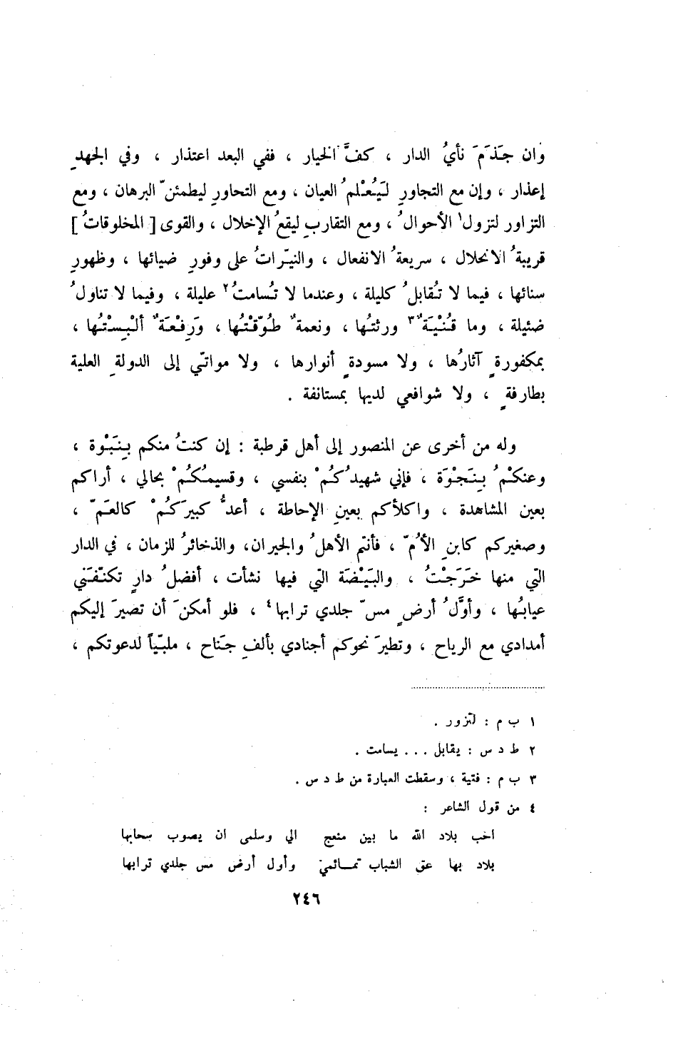 وله من أخرى عن المنصور إلى أهل قرطبة: إن كنت منكم بنبوة، وعنكم بنجوة، فإني شهيدكم بنفسي، وقسيمكم بحالي، أراكم بعين المشاهدة، واكلأكم بعين الإحاطة، أعد كبيركم كالعم، وصغيركم كابن الأم، فأنتم الأهل والجيران، والذخائر للزمان، في الدار التي منها خرجت، والبيضة التي فيها نشأت، أفضل دار تكنفني عيابها، وأول أرض مس جلدي ترابها، فلو أمكن أن تصير إليكم أمدادي مع الرياح، وتطير نحوكم أجنادي بألف جناح، ملبيا لدعوتكم