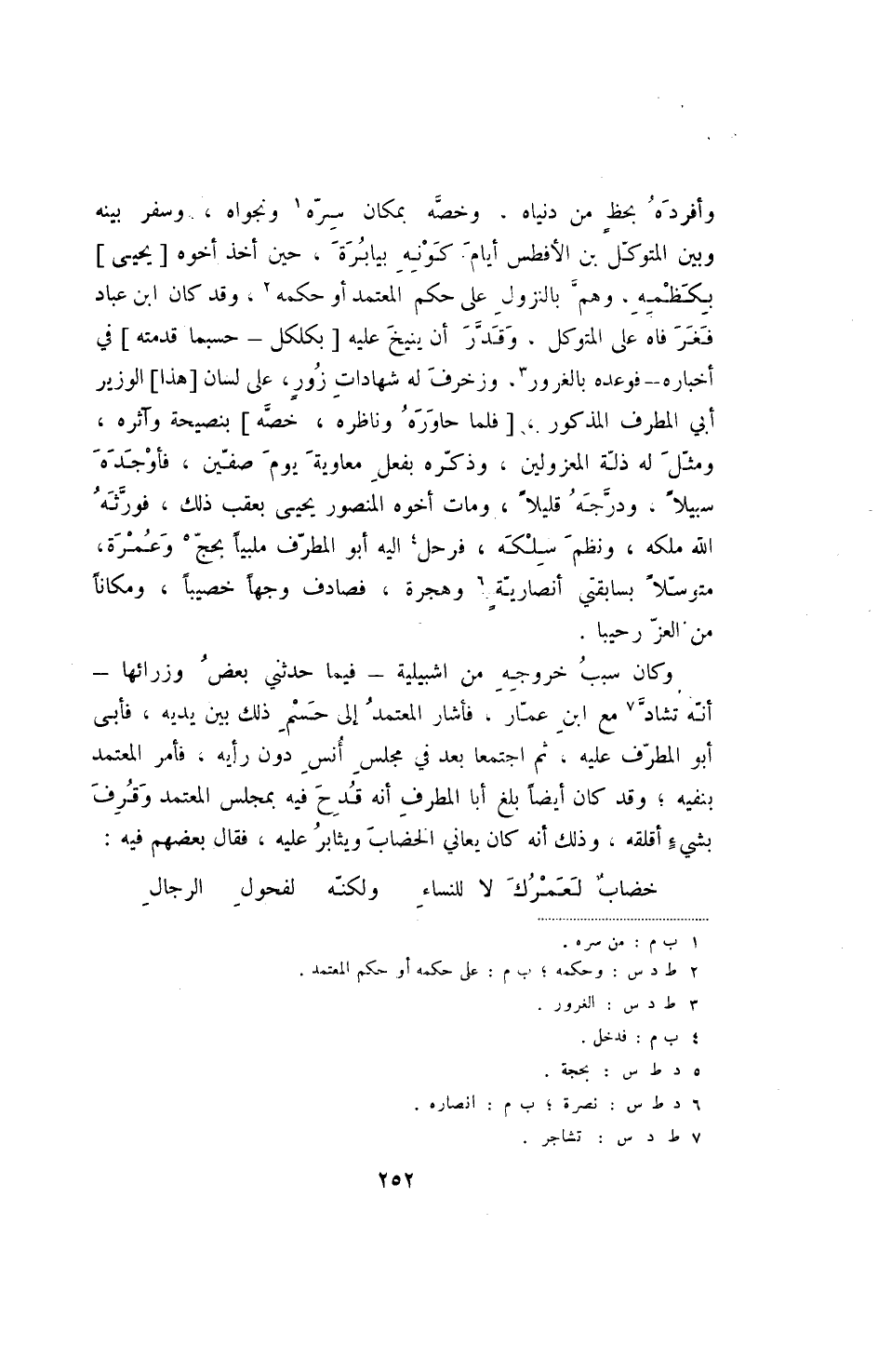 وأفرده بحظ من دنياه، وخصه بمكان سره ونجواه، وسفر بينه وبين المتوكل بن الأفطس أيام كونه بيابرة، حين أخذ أخوه [يحيى] بكظمه، وهم بالنزول على حكم المعتمد أو حكمه، وقد كان ابن عباد فغر فاه على المتوكل، وقدر أن ينيخ عليه [بكلكل - حسبما قدمته] في أخباره - فوعده بالغرور وزخرف له شهادات زور، على لسان [هذا] الوزير أبي المطرف المذكور، [فلما حاوره وناظره، خصه] بنصيحة أثره، ومثل له ذلة المعزولين، وذكره بفعل معاوية يوم صفين، فأوجده سبيلا، ودرجه قليلا، ومات أخوه المنصور يحيى بعقب ذلك، فورثه الله ملكه، ونظم سلكه، فرحل اليه أبو المطرف ملبيا بحج وعمرة، متوسلا بسابقي أنصارية وهجرة، فصادف وجها خصيبا، ومكانا من العز رحيبا.