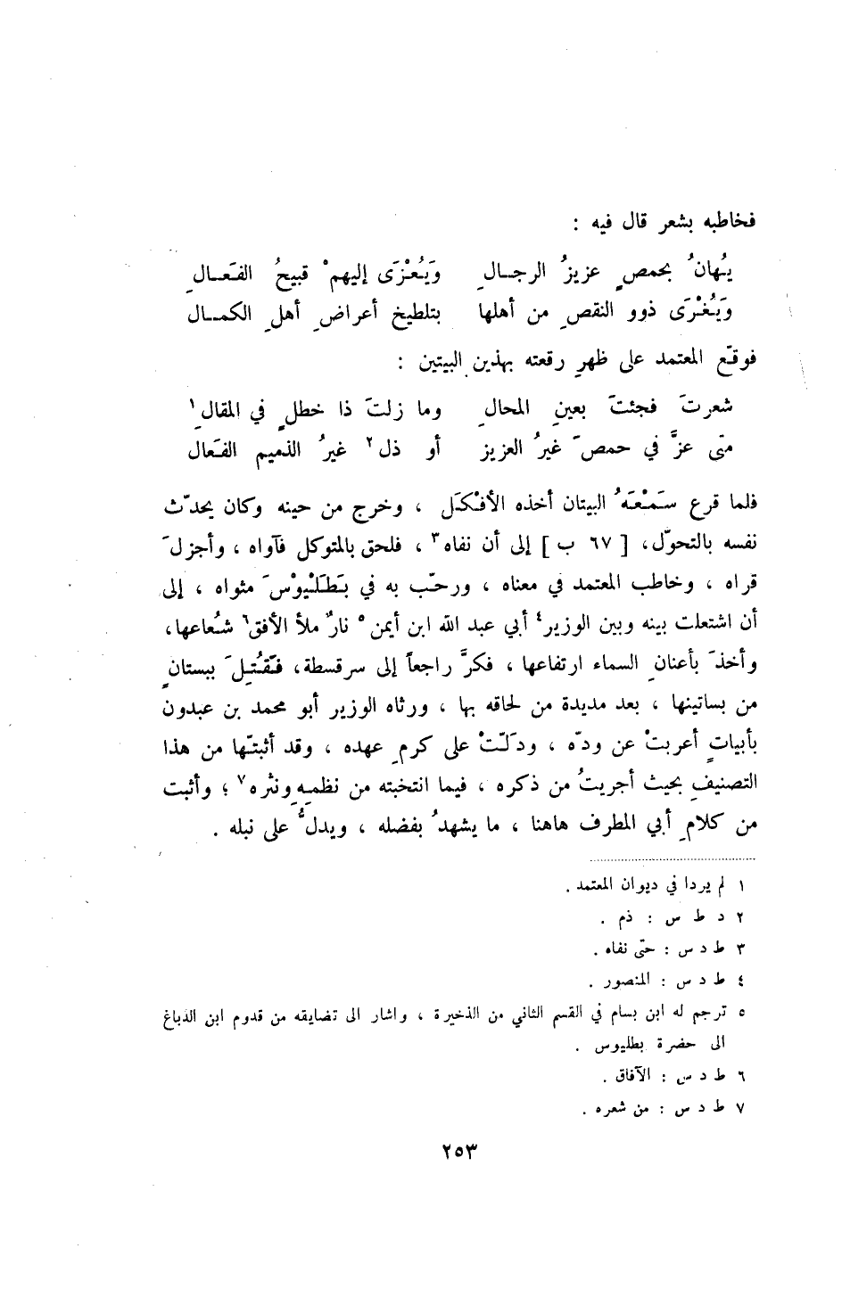 فلما قرع سمعه البيتان أخذه الأفكل، وخرج من حينه وكان يحدث نفسه بالتحول، [67 ب] إلى أن نفاه، فلحق بالمتوكل فآواه، وأجزل قراه، وخاطب المعتمد في معناه، ورحب به في بطليموس مثواه، إلى أن اشتعلت بينه وبين الوزير أبي عبد الله ابن أيمن نار ملأ الأفق شعاعها، وأخذ بأعنان السماء ارتفاعها، فكر راجعا إلى سرقسطة، فقتل ببستان من بساتينها، بعد مديدة من لحاقه بها، ورثاه الوزير أبو محمد بن عبدون بأبيات أعربت عن وده، ودلت على كرم عهده، وقد أثبتها من هذا التصنيف بحيث أجريت من ذكره، فيما انتخبته من نظمه ونثره؛ وأثبت من كلام أبي المطرف هاهنا، ما يشهد بفضله، ويدل على نبله.