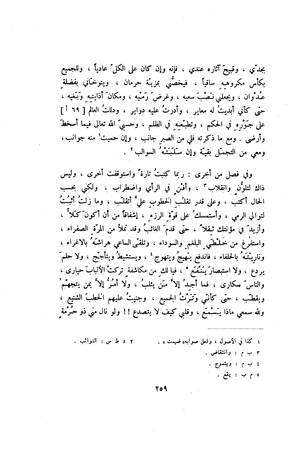 وفي فصل من أخرى: ربما كتبت تارة واستوقفت أخرى، وليس ذاك لتلون وانقلاب، وأفن في الرأي واضطراب، ولكني بحسب الحال أكتب، وعلى قدر تقلب الخطوب علي أتقلب، وما زلت أثبت لتوالي الرمي، وأستمسك على قوة الرزء، إشفاقا من أن أكون كلا، وأزيد في مؤنتك ثقلا، حتى قدم الغائب وقد تملأ من المرة الصفراء، واستفرغ من خلطي البلغم والسوداء، وتلقى الساعي هراشة بالاغراء، وناريته بالحلفاء، فاندفع يهيج ويتهوج، ويستشيط ويتأجج، ولا حلم يردع، ولا استبصار ينفع، فيا لك من مكاشفة تركت الألباب حيارى، والناس سكارى، فما أجد إلا من يثلب، ولا أمر إلا بمن يتهجم ويقطب، حتى كأني وترت الجميع، وجنيت عليهم الخطب الشنيع، ولله سمعني ماذا يسمع، وقلبي كيف لا يتصدع!! ولو نال مني ذو حرمة