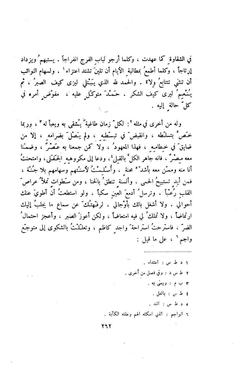 في الشقاوة كما عهدت، وكلما أرجو لباب الفرج انفراجا، يستبهم ويزداد إرتاجا، وكلما أطمع بمطالبة الأيام أن تلين تشتد اعتزاء، ولسهام النوائب أن تنثني تتتابع ولاء، والحمد لله الذي يبتلي ليرى كيف الصبر، ثم ينعم ليرى كيف الشكر، حمد متوكل عليه، مفوض أمره في كل حالة إليه.