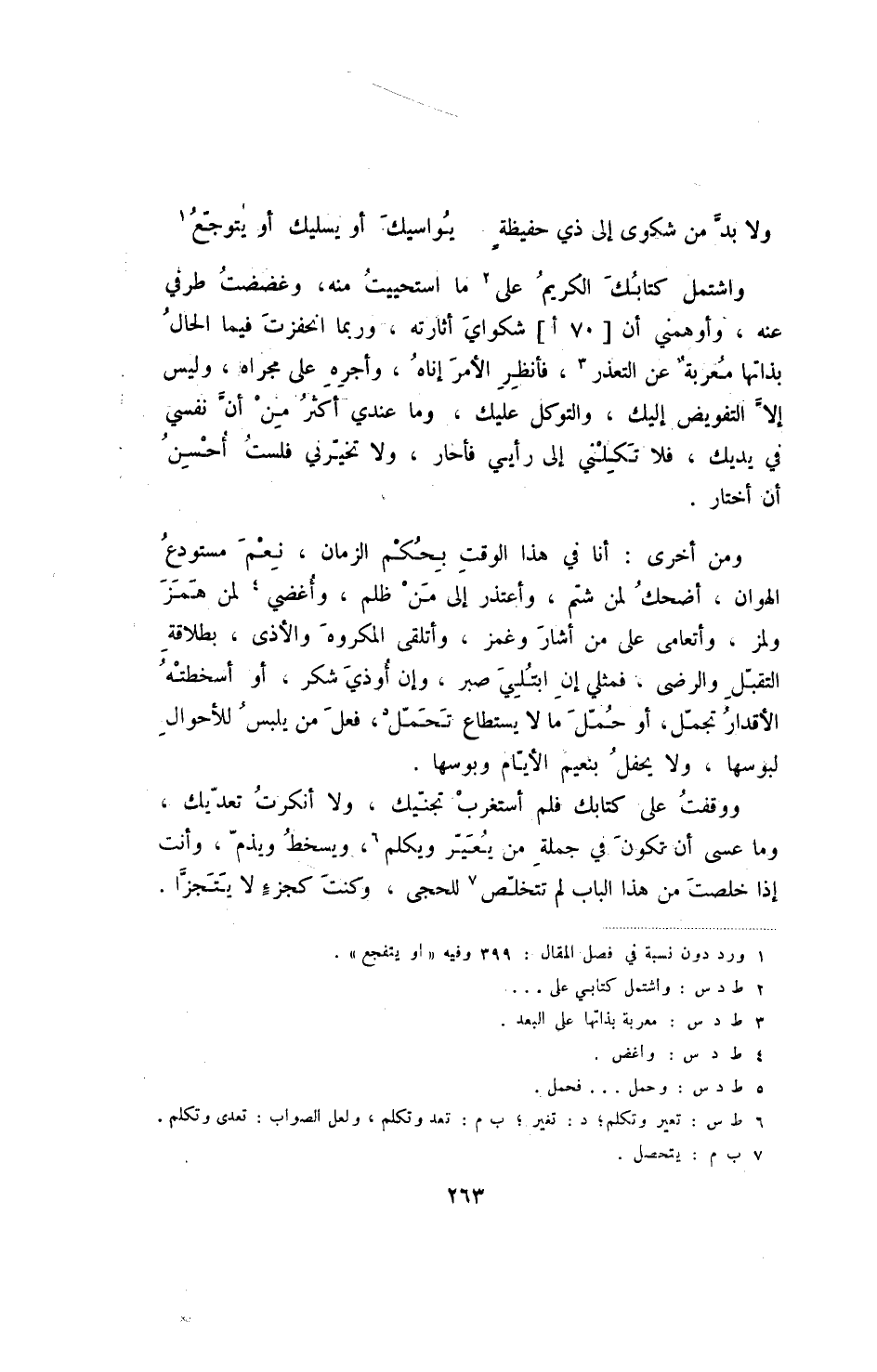 ووقفت على كتابك فلم أستغرب تجنبك، ولا أنكرت تعديك، وما عسى أن تكون في جملة من يعبر ويكلم، ويسخط ويذم، وأنت إذا خلصت من هذا الباب لم تتخلص للحجى، وكنت كجزء لا يتجزا.